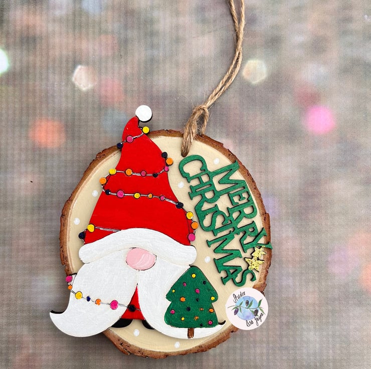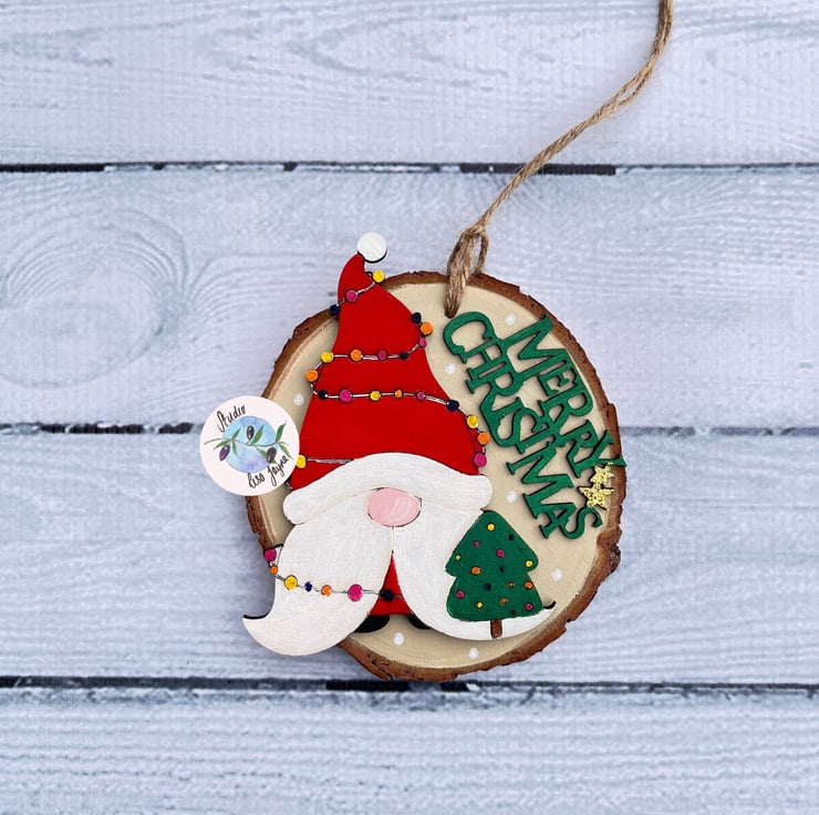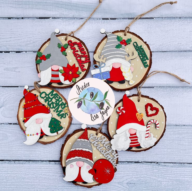 Natural log slices, each painted in a neutral colour palette featuring a Christmas gnomegonk.