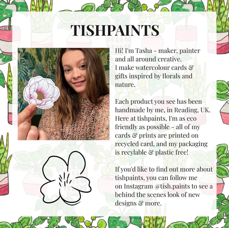 - All of my designs have been painted by me using watercolours and printed onto recycled card.