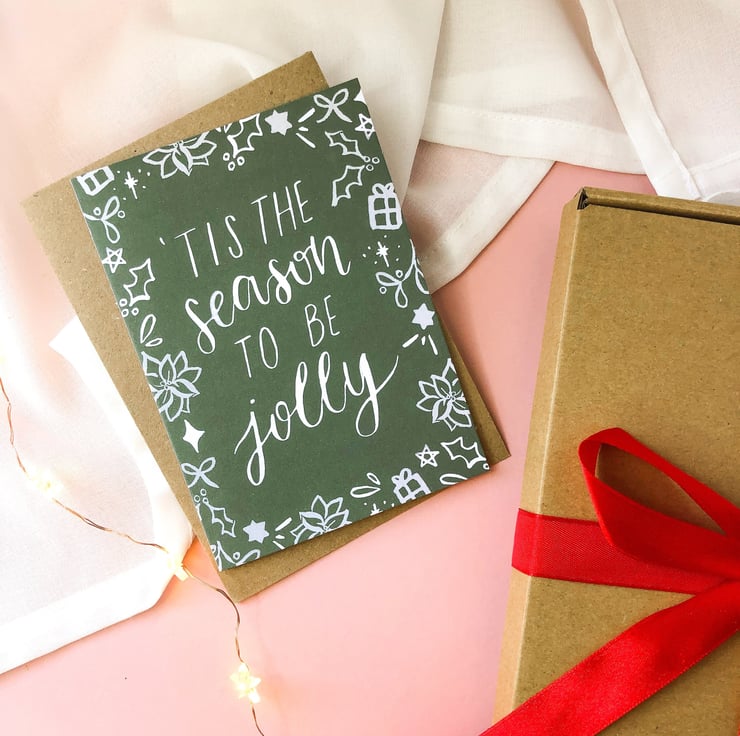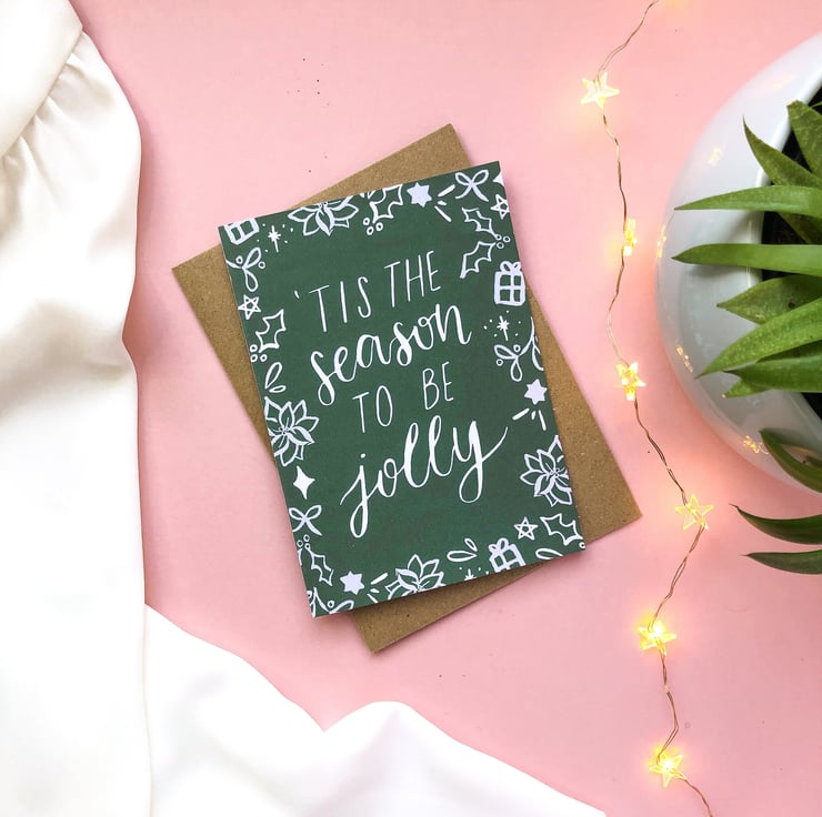 Send some Christmas wishes with this elegant 'Tis The Season To Be Jolly calligraphy card, featuring poinsettia, holly, mistletoe & more.
