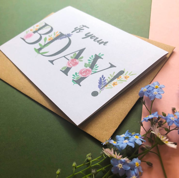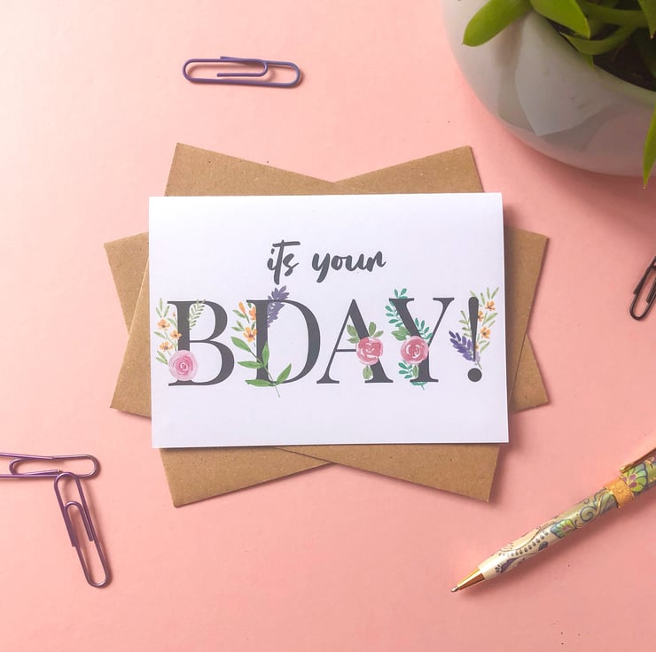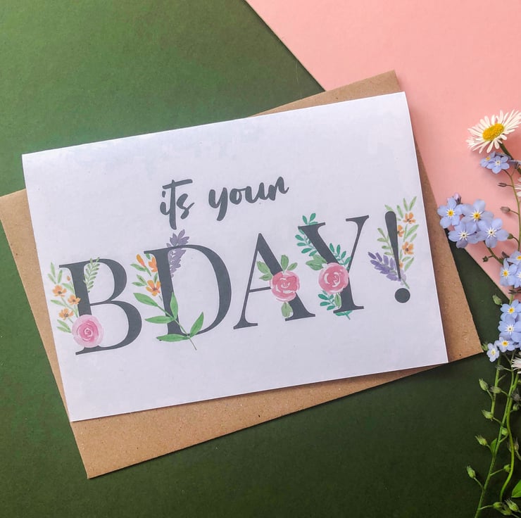 Say happy birthday with this elegant floral card which reads 'it's your bday!'.