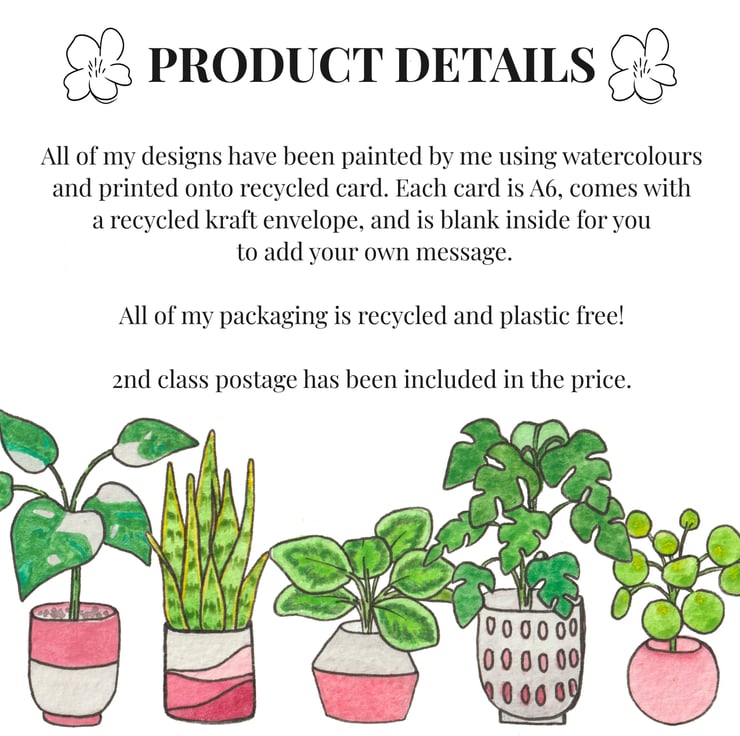 - All of my designs have been painted by me using watercolours and printed onto recycled card.