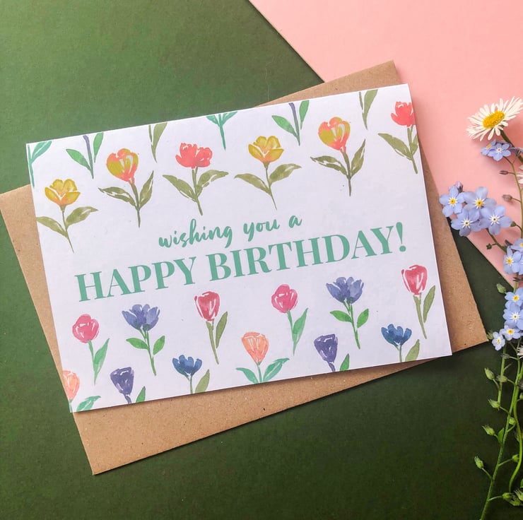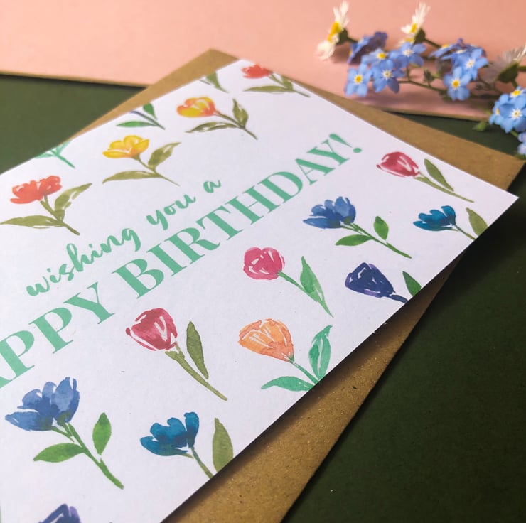 Say happy birthday with this gorgeous floral card inspired by spring flowers, which reads 'wishing you a happy birthday'.