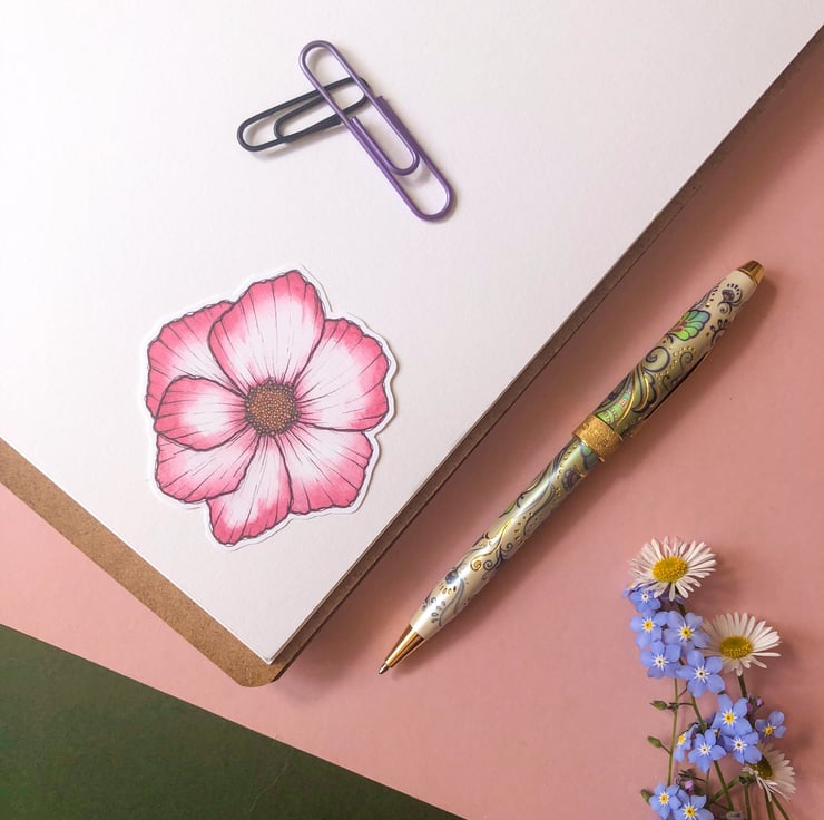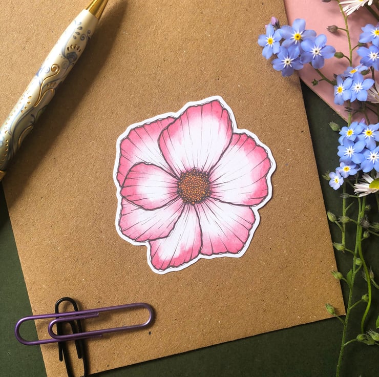 Pink Cosmo Floral, Botanical Sticker Watercolour Summer Flowers Handmade Sticker