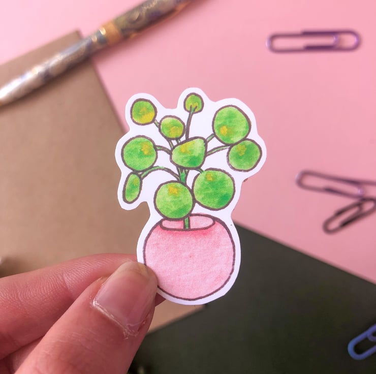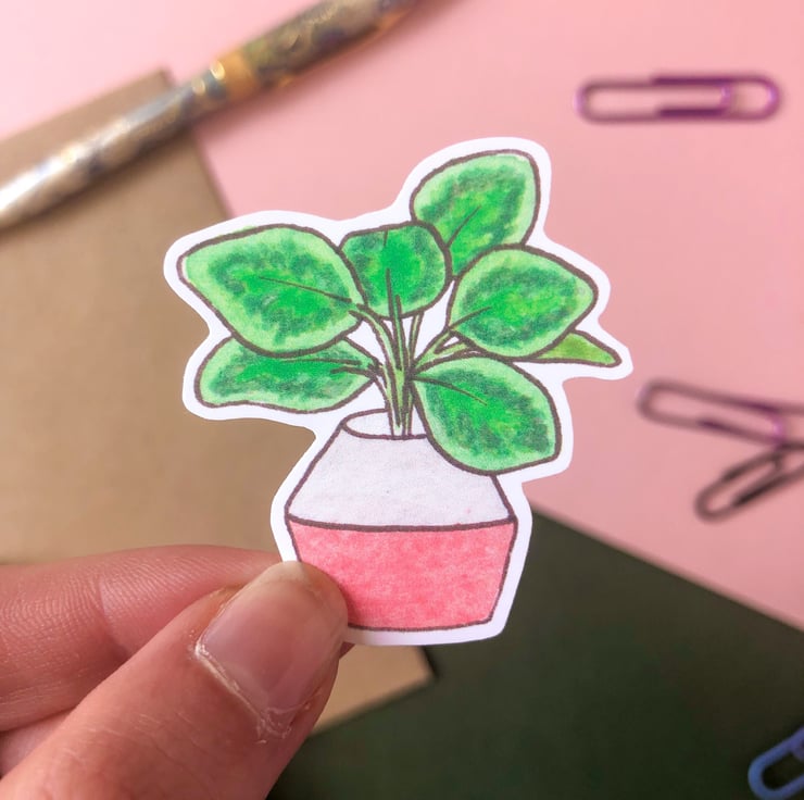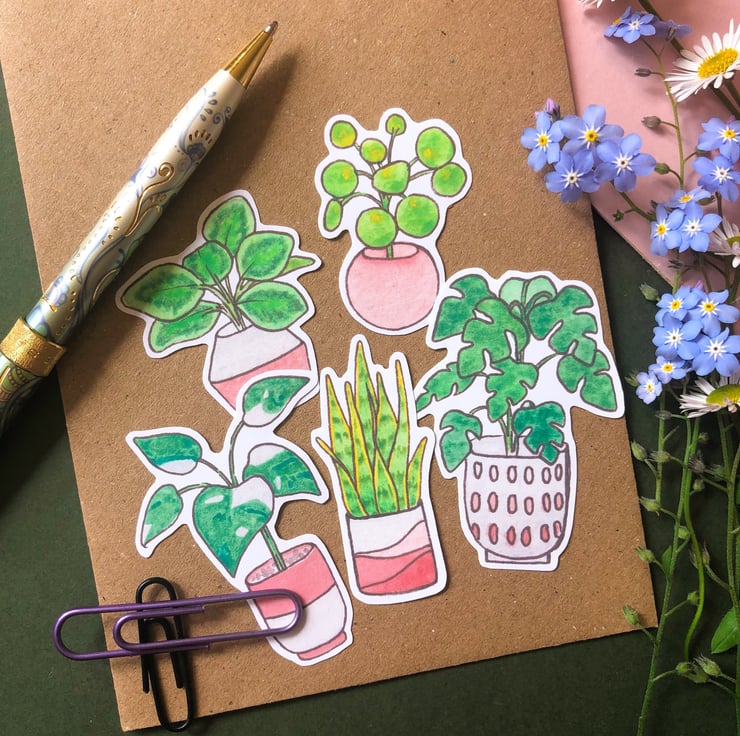 This cute house plant sticker pack contains 5 stickers of different sizes: a monstera, philodendron, pilea/chinese money plant, snake plant & calathea. Each plant is a vibrant green and in different designed pink & white pots!