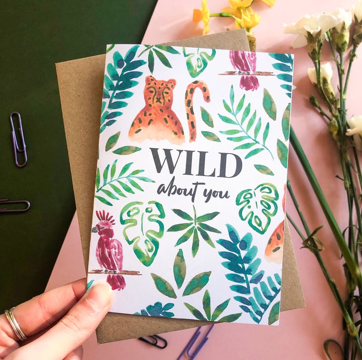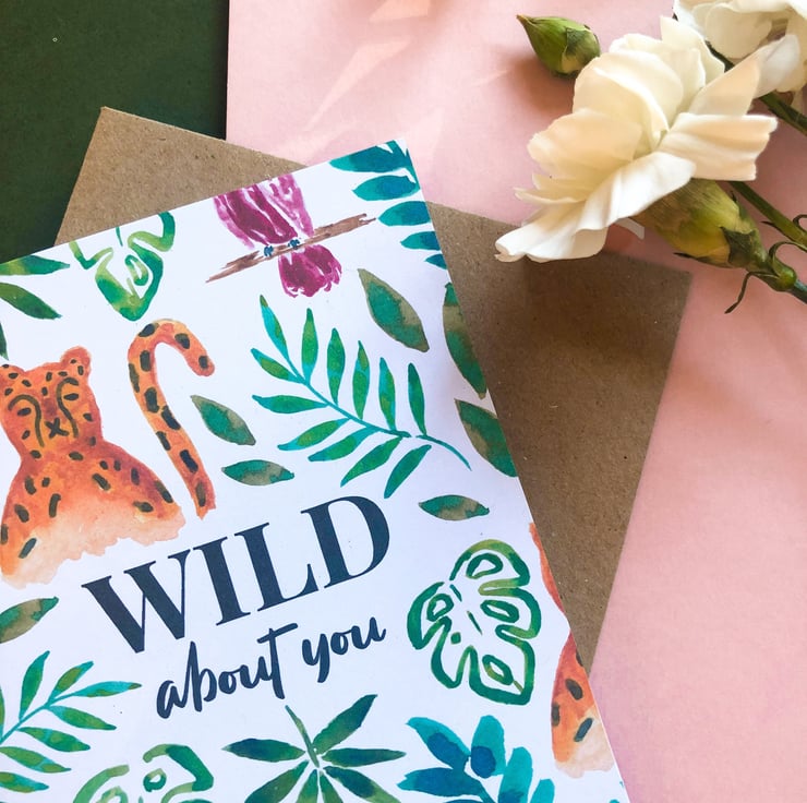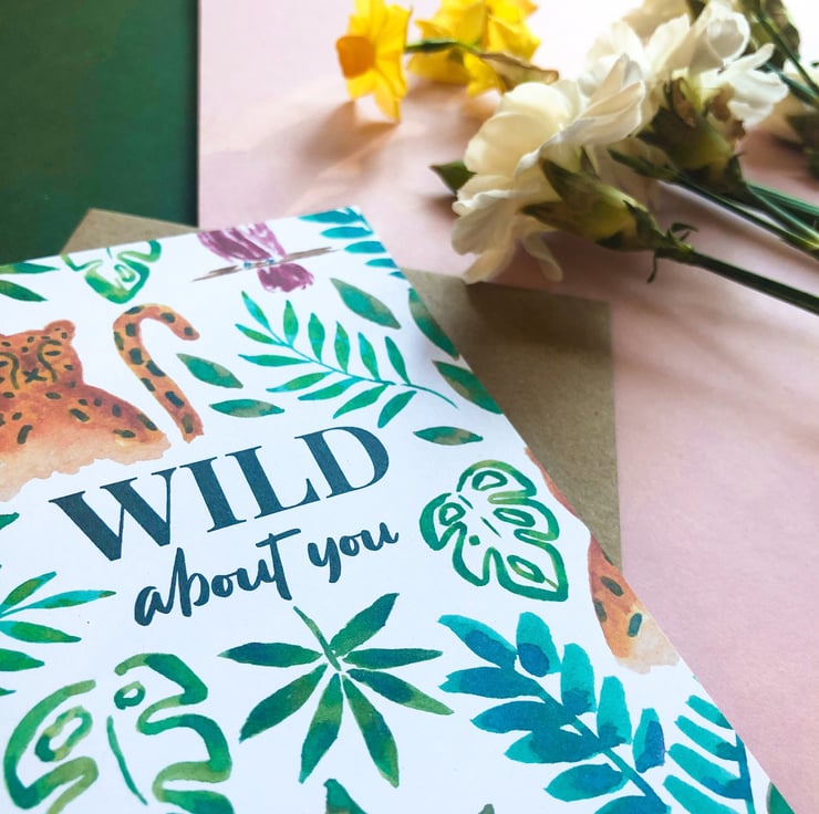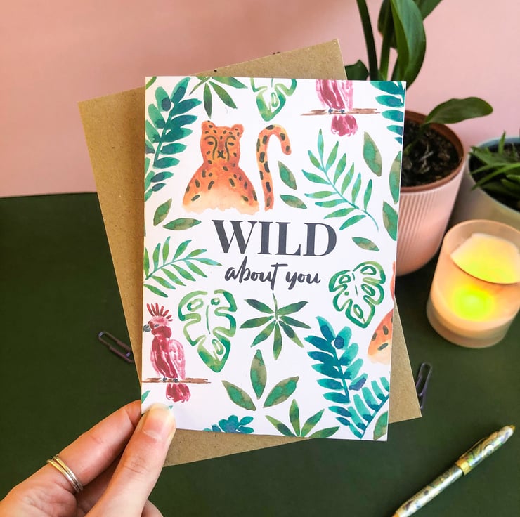 Send some love with this floral 'WILD about you' card, featuring tropical leaves, leopards & more!