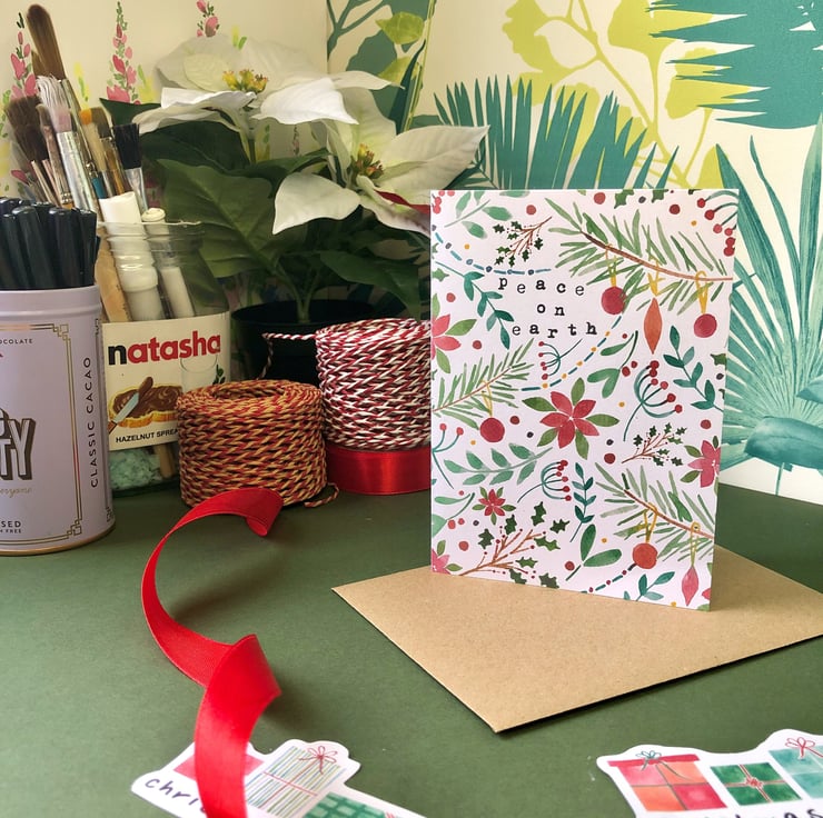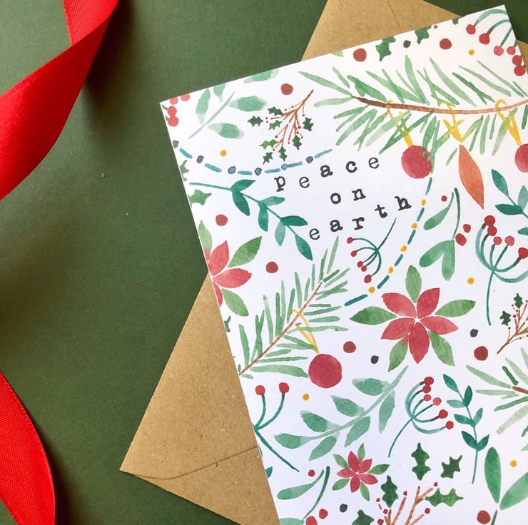 Send some Christmas peace with this classic seasonal pattern Christmas card, which reads peace on earth.
