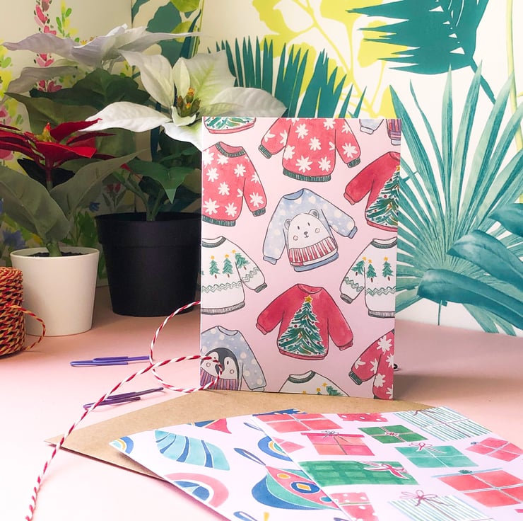 Featuring various funky Christmas jumpers on a light pink background, this design is available as a single card or a pack of 5, or as a part of my Retro Christmas Charity Multipack.