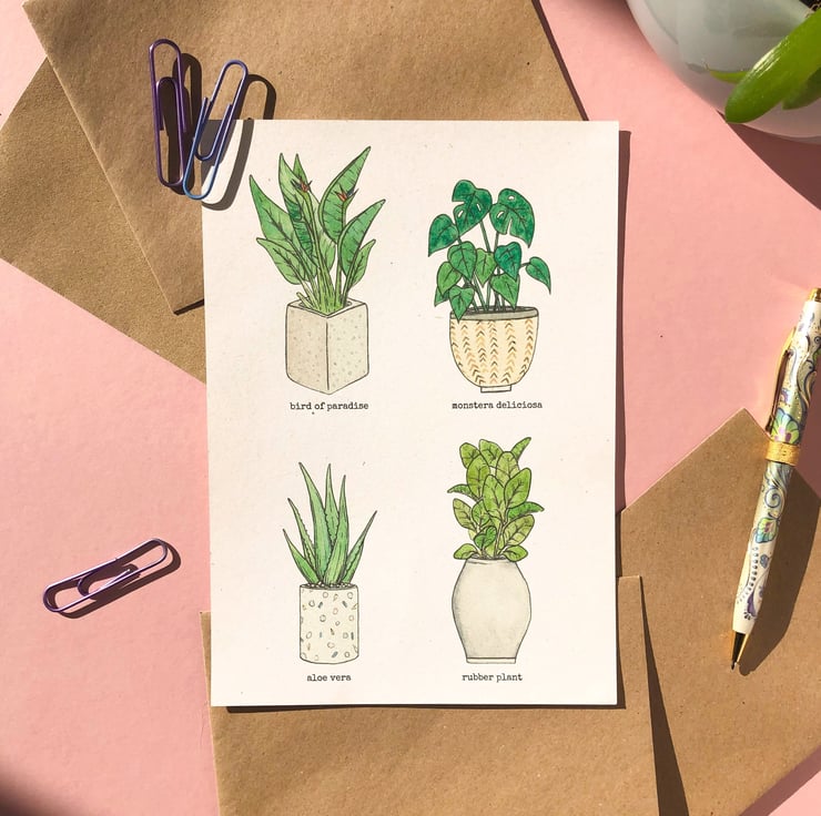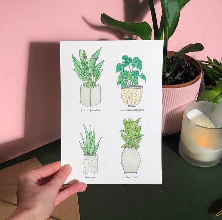 This print is inspired by my ever-growing collection of house plants, including my monstera called Molly, and my snake plant called Stevie!