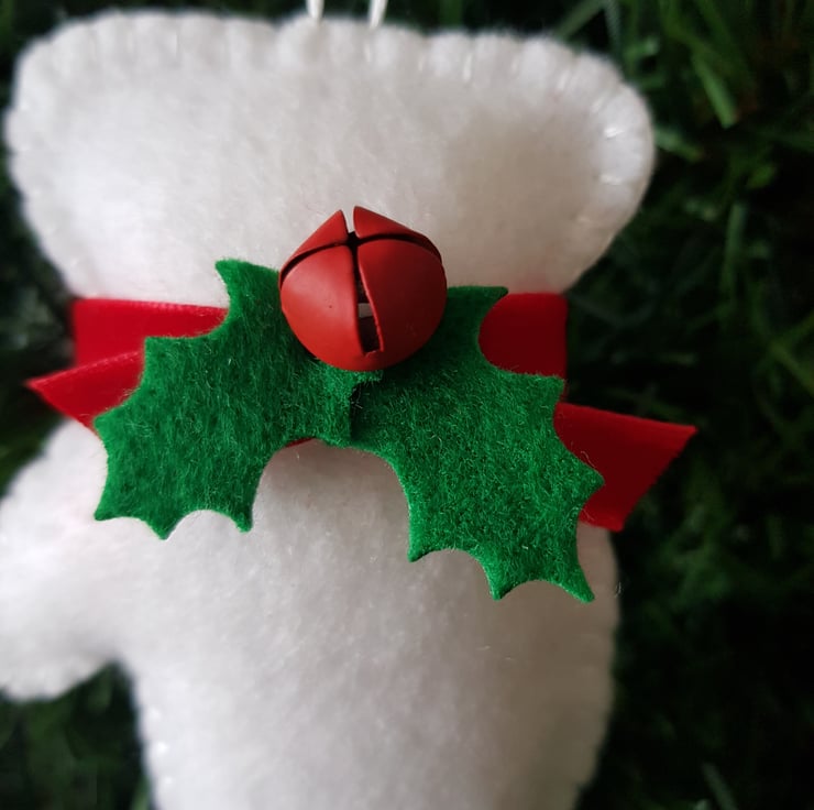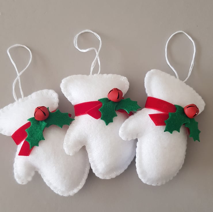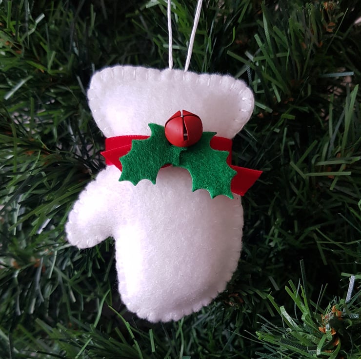 Hand stitched white felt christmas mitten. Lightly padded. Trimmed with red velvet ribbon, green felt holly leaves and a red bell.