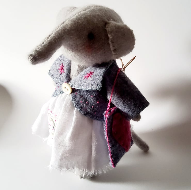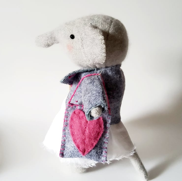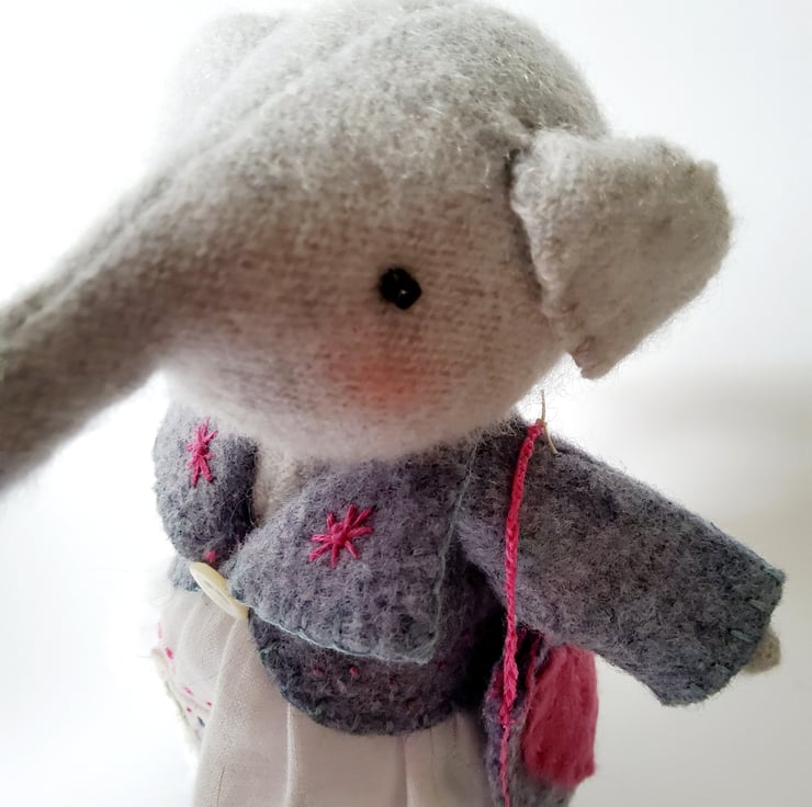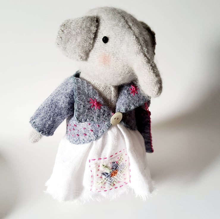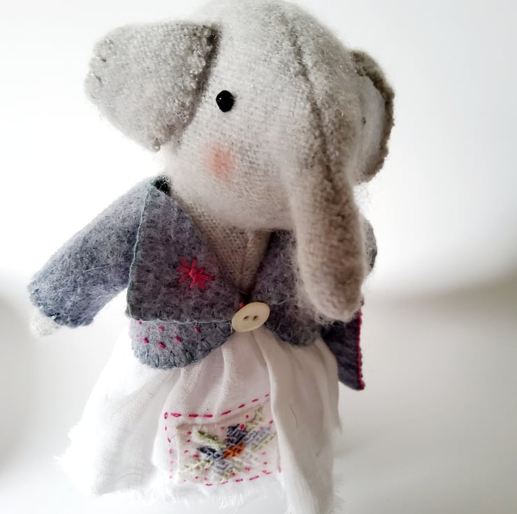 Sweet little freestanding handstitched cashmere elephant. She is about 16.5 cms tall and wears a little embroidered felt jacket and a linen skirt , trimmed with a piece of vintage embroidery. She has glass bead eyes and flushed cheeks. Her tail and arms contain wire and can be gently repositioned. Her shoulder bag is made from felt with a heart appliquéd onto the front.