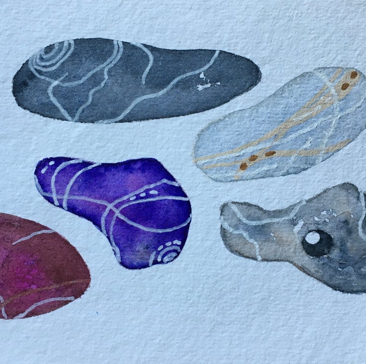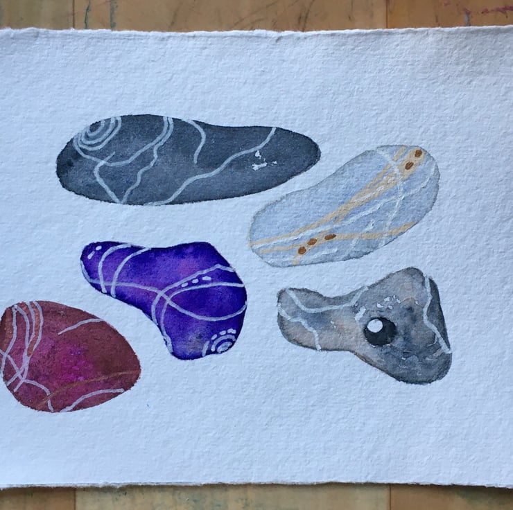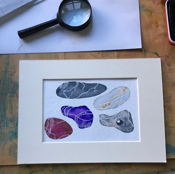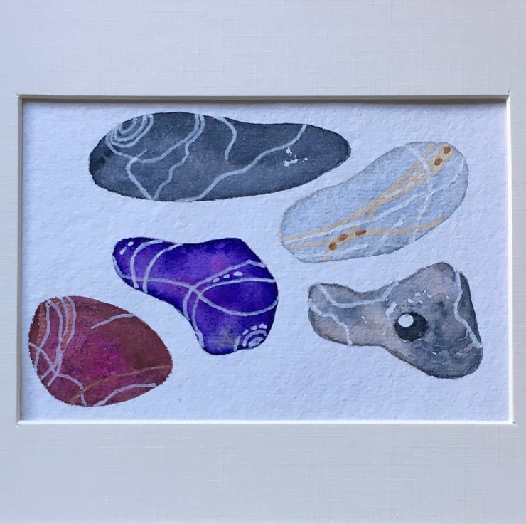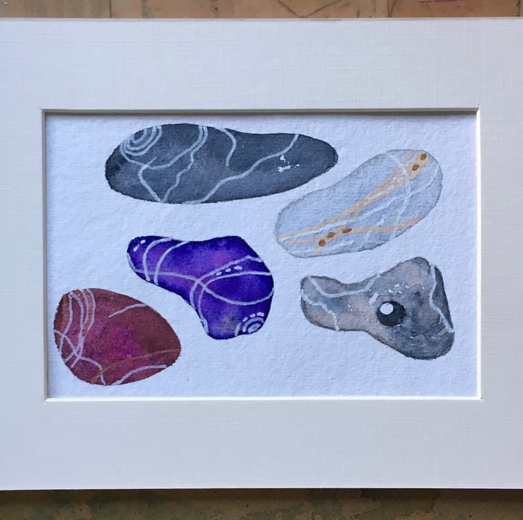 This is a hand painted original, based on pebbles collected from the beach. It is painted on hand made Khadi watercolour paper using Artist quality materials and measures 15cm x 10cm approx. It will be sent with a mount, placed in a cello bag within a sturdy envelope, postage free to UK destinations.