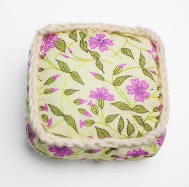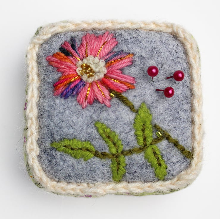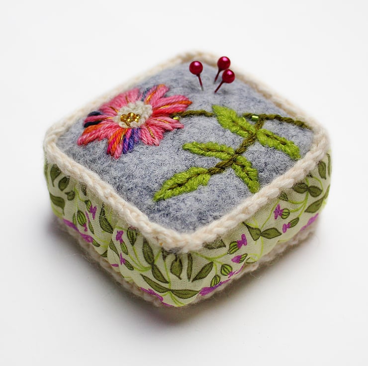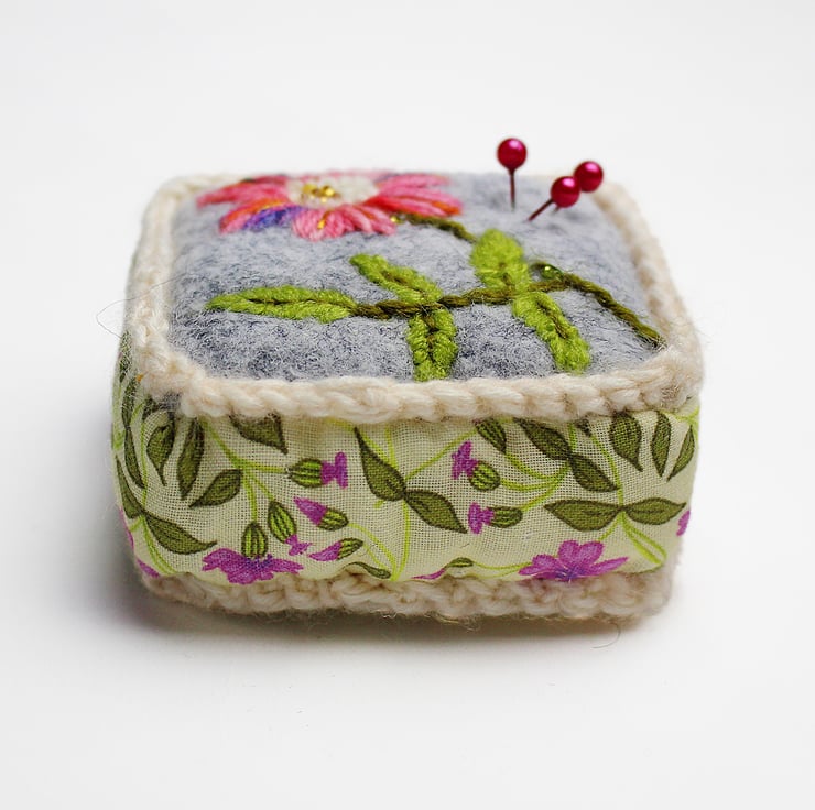 Handmade half cube shaped pincushion with grey colour felt on top and my campion print in pink and cream on the sides and base, printed on cotton. The pin cushion is hand embroidered with a dog rose on the top. The half cube measures 7cms(2.5ins) in width and 2.5ams(1inch) depth. A crochet trim has been added to the seams in cream yarn. The pincushion comes with some pins.