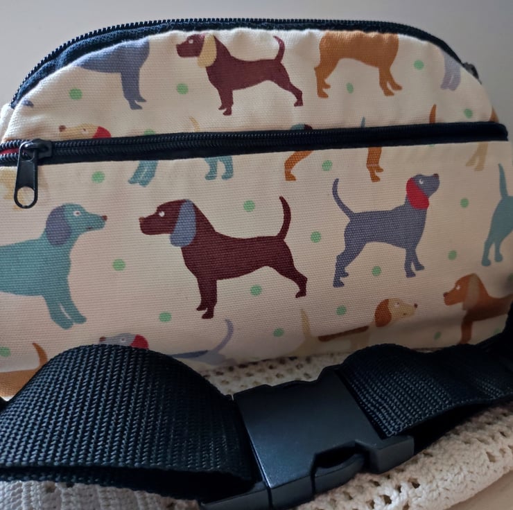 The belt bag has a main compartment with a small inner pocket and a front pocket.