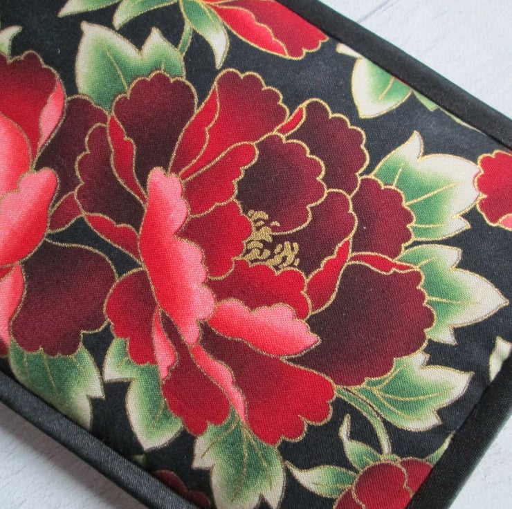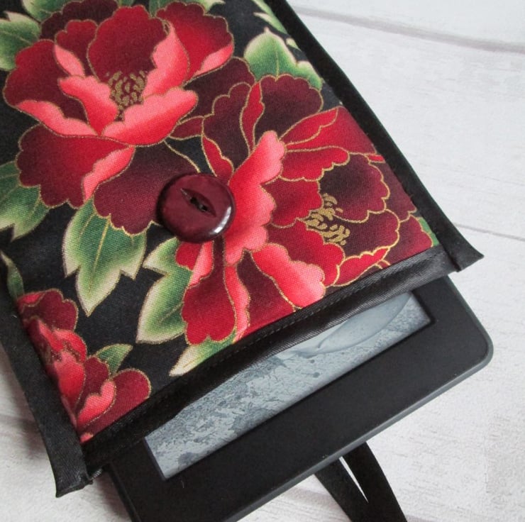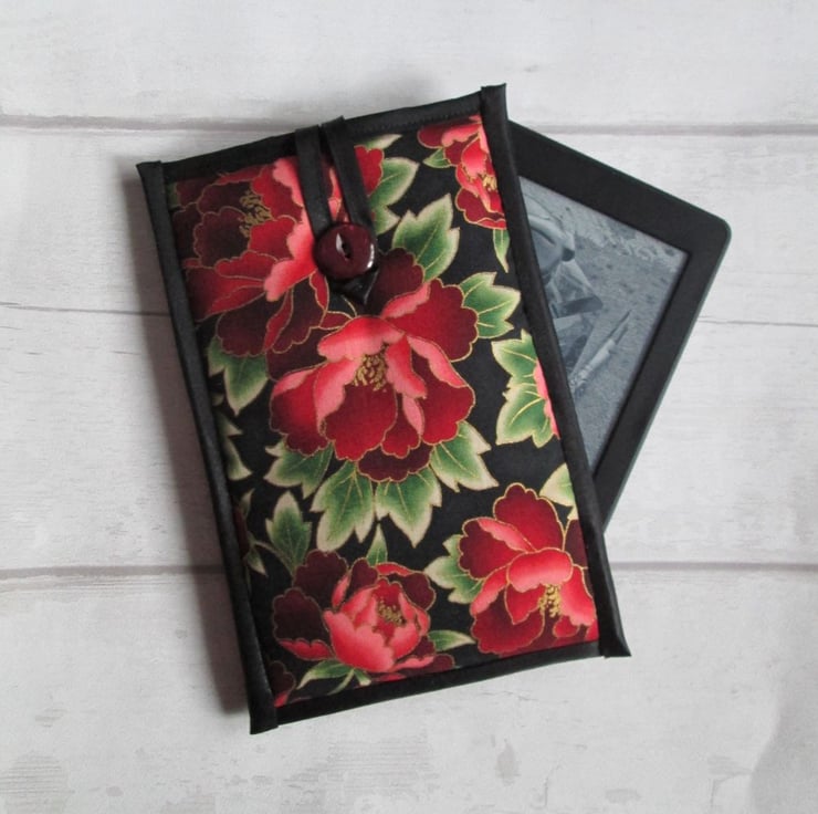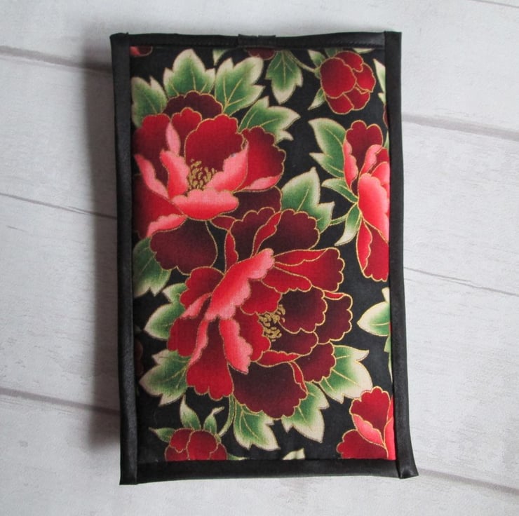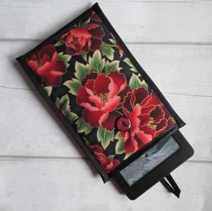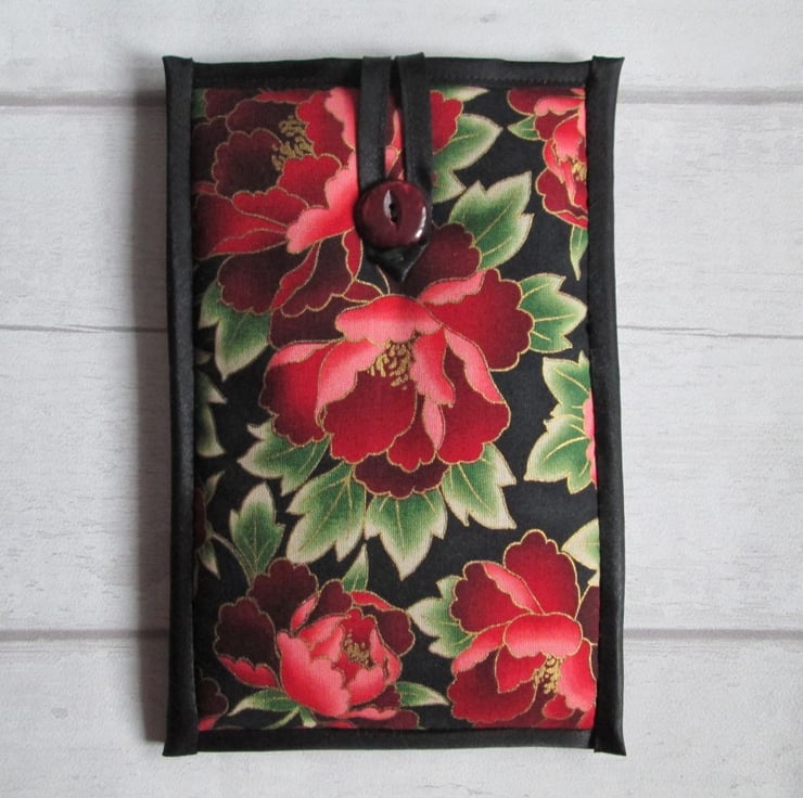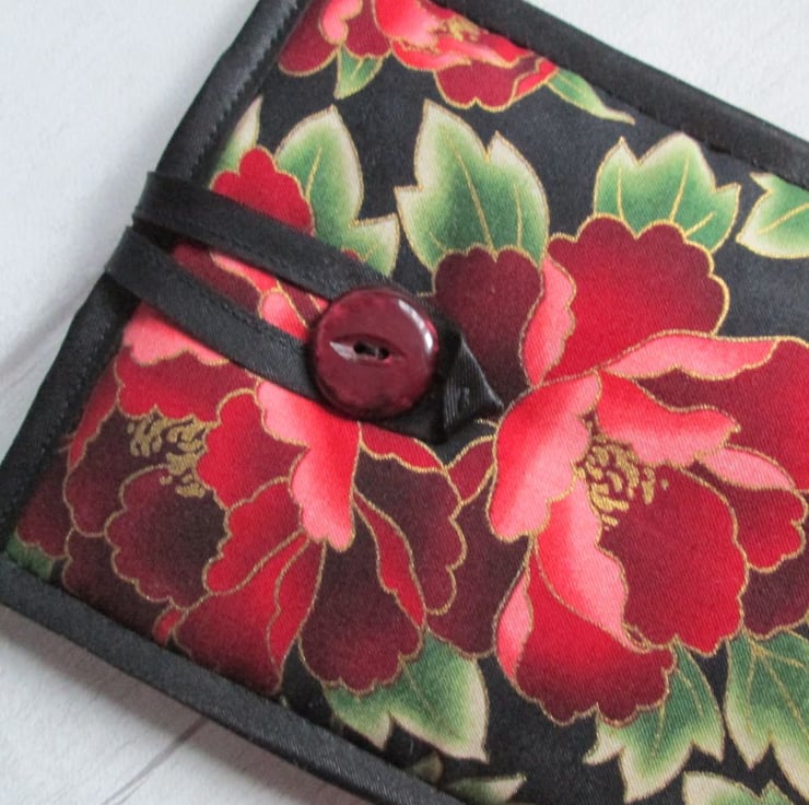 A beautiful Kindle/E-reader case in a rich, oriental style, print of red paeonies with green leaves on a black background, picked out in metallic gold. This is one of my all time favourite prints and I discovered a couple of leftover pieces that were just the right size for this case.