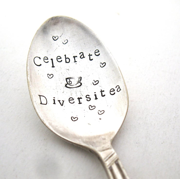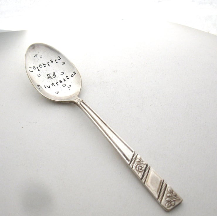 Celebrate DiversiTea with this hand stamped vintage teaspoon. The wording is in black lettering in the bowl and the spoon is approximately 5" (12cm) long. It has a floral detail on the handle.