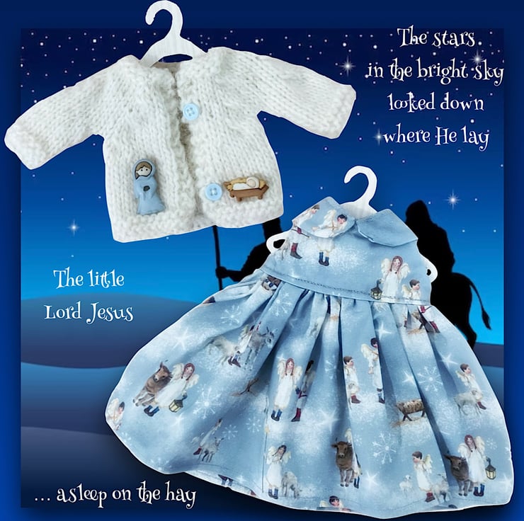 A beautiful Daniela Drescher nativity print dress. The dress is handmade from designer cotton, has a lined bodice and fastens at the back with a little popper. A gorgeous gift for a little one at Christmas - or indeed for anyone who loves dolls.