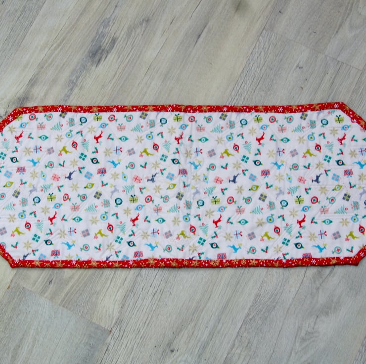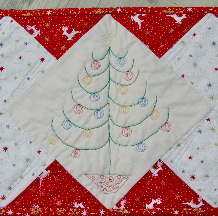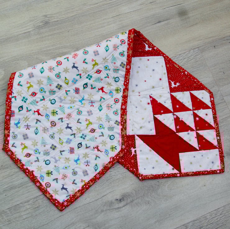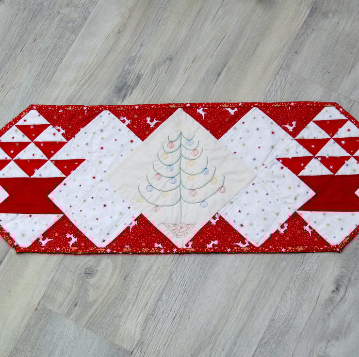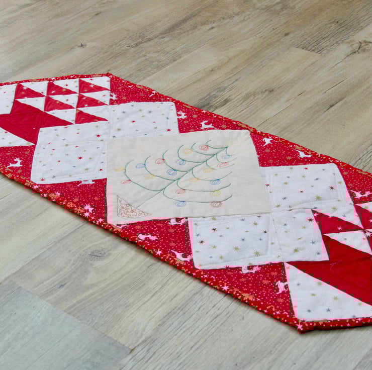 The table runner is approximately 34 inches (76cm) by 11.5 inches (29cm) at its widest points. The front features a central diamond of cream fabric with a Christmas tree and baubles created using free-motion quilting to 'draw' the tree in thread. The outer diamonds are a traditional patchwork basket block in red and cream with stars. The three diamonds are connected with patchwork peices using the same cream with stars fabric as the background on the patchwork blocks. The runner is backed using a cream fabric with scattered Christmas motifs and there is a layer of eco-friendly wadding in the centre which is made using recycled plastic bottles.