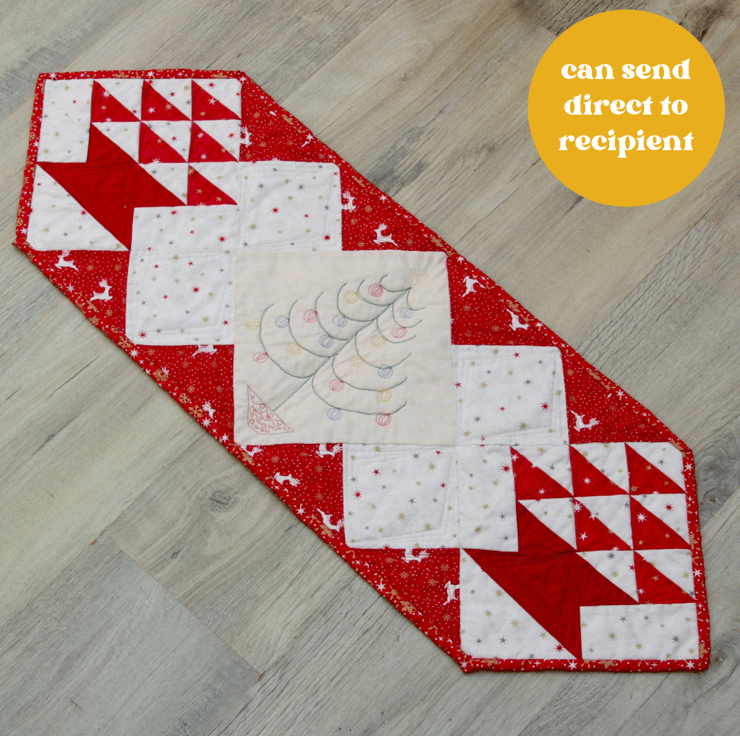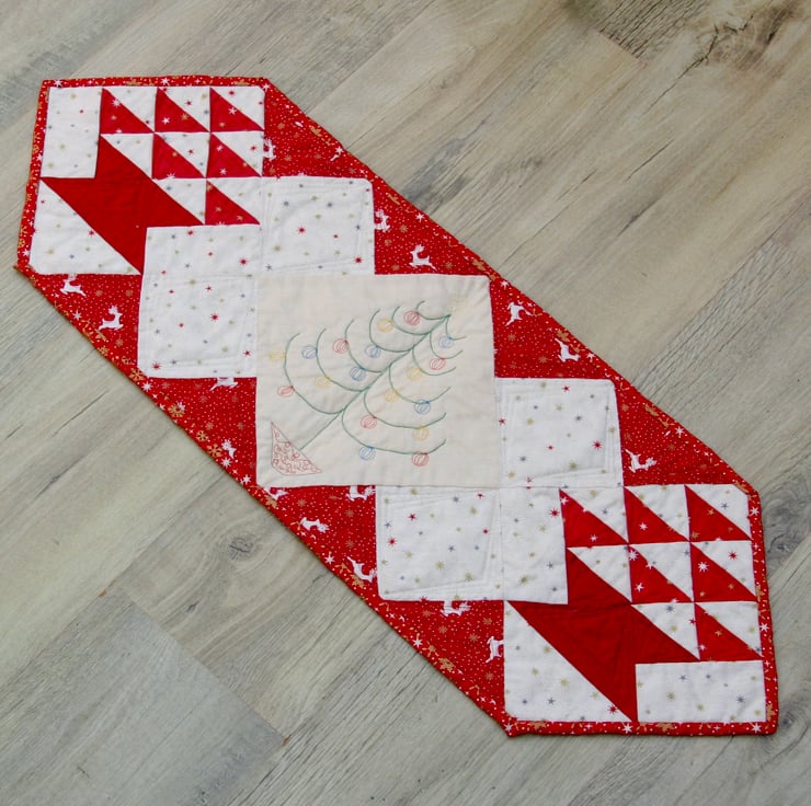 Decorate your table with the festive table runner with traditional basket patchwork at either end and a Christmas tree in the centre.