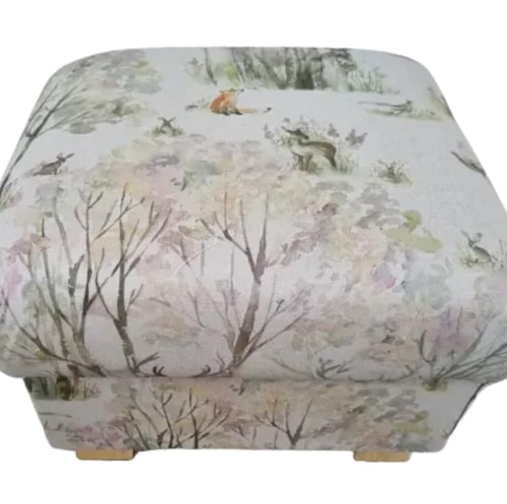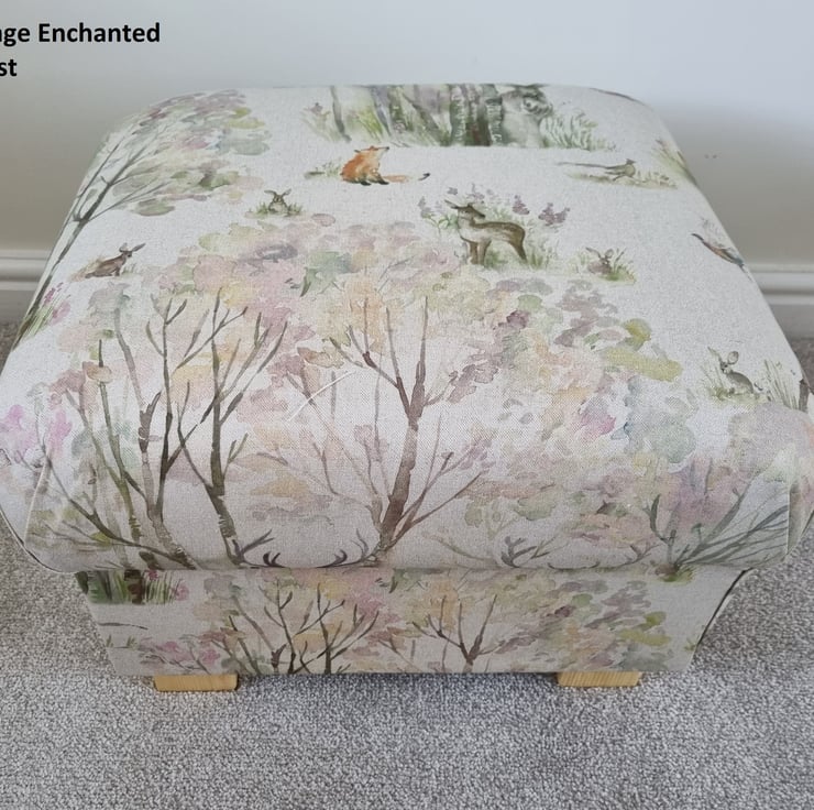 I am a professional upholsterer with over 33 years experience, and have handmade this adult sized STORAGE footstool using Voyage Enchanted Forest fabric.
