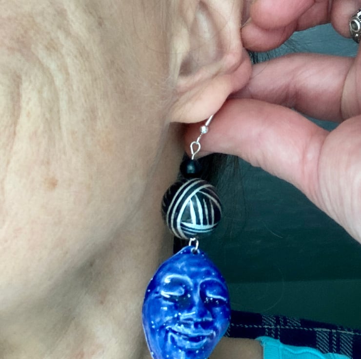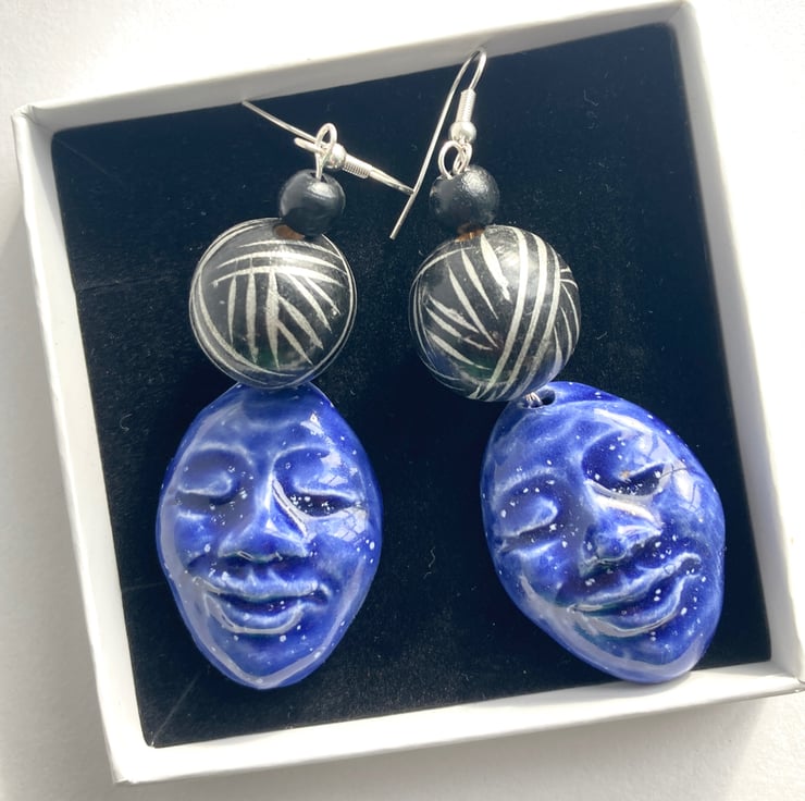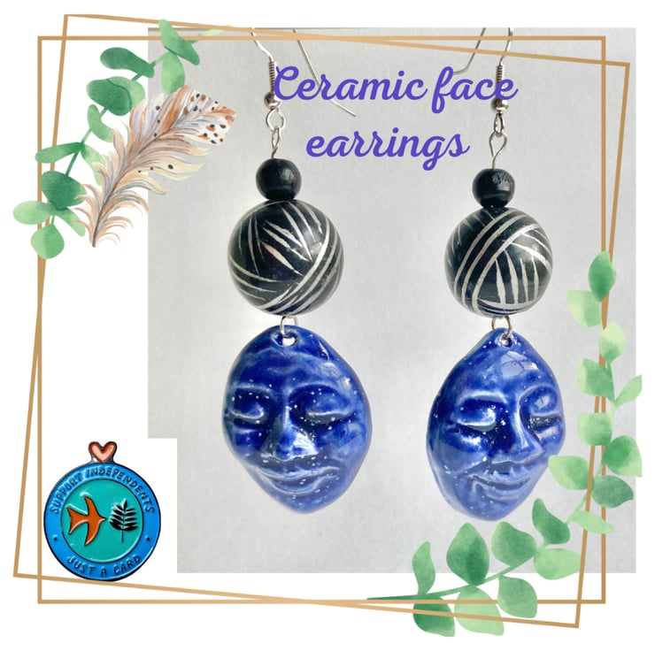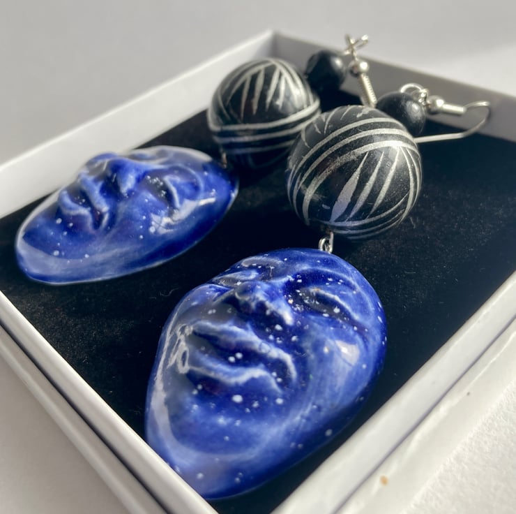 Handmade ceramic faces from my original mould, signed on the back and glazed in moonlight blue earthenware.