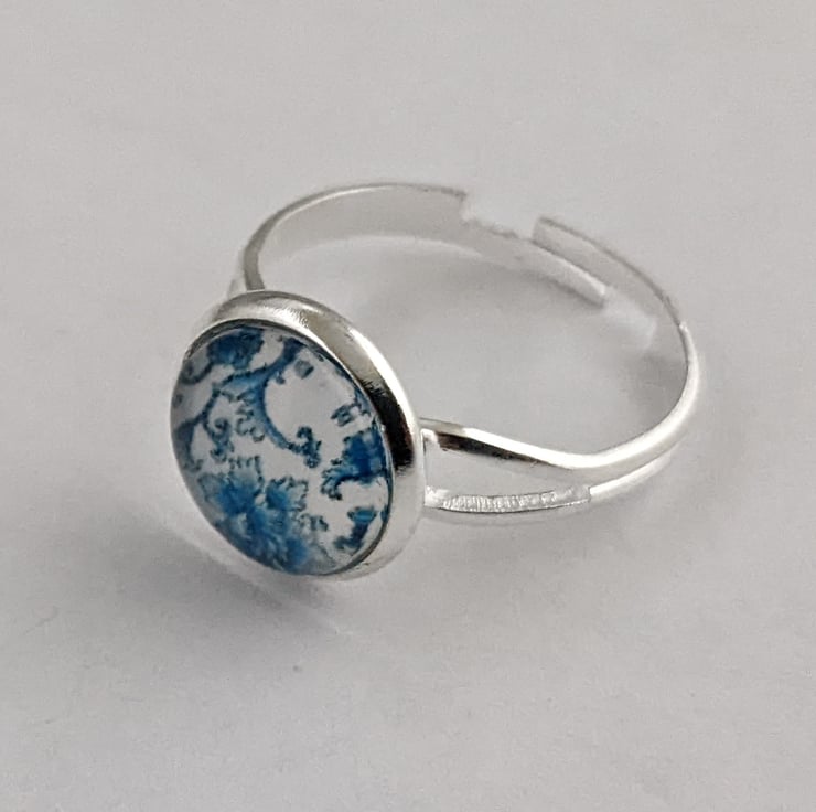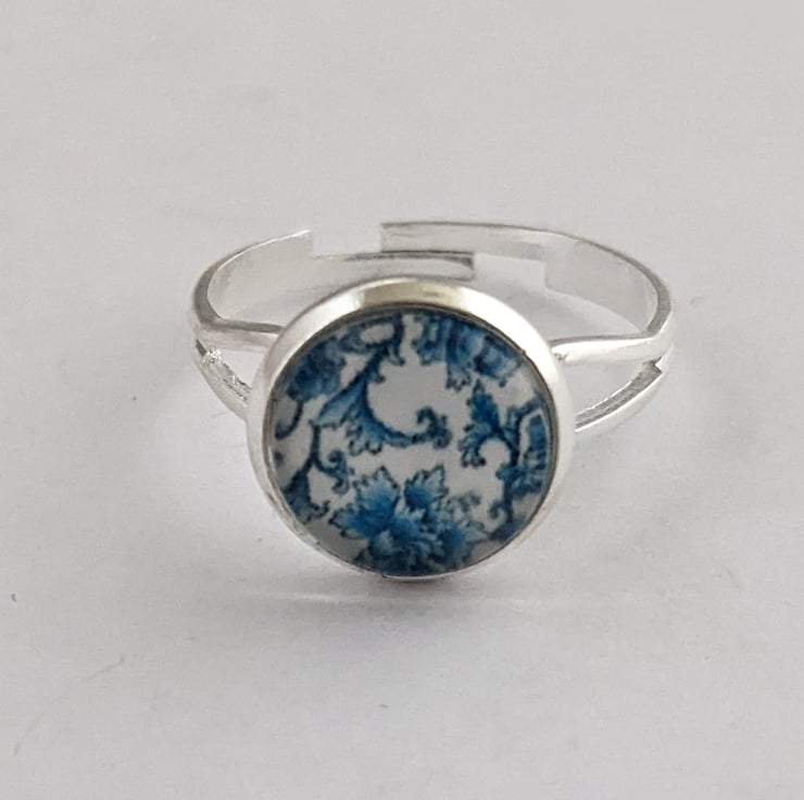 10mm blue and white glass cabochon in a silver plated adjustable ring setting.