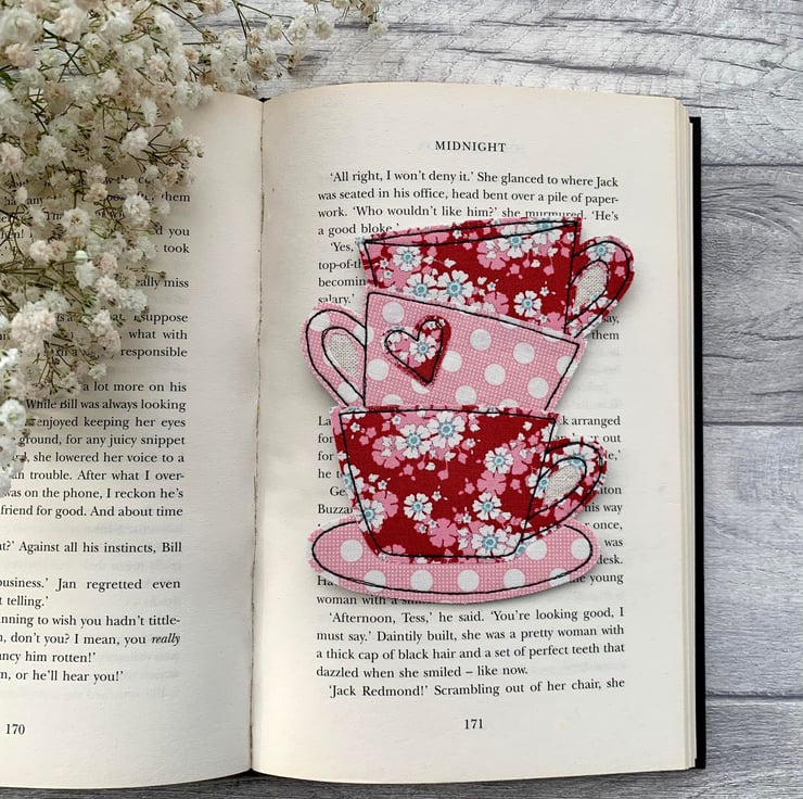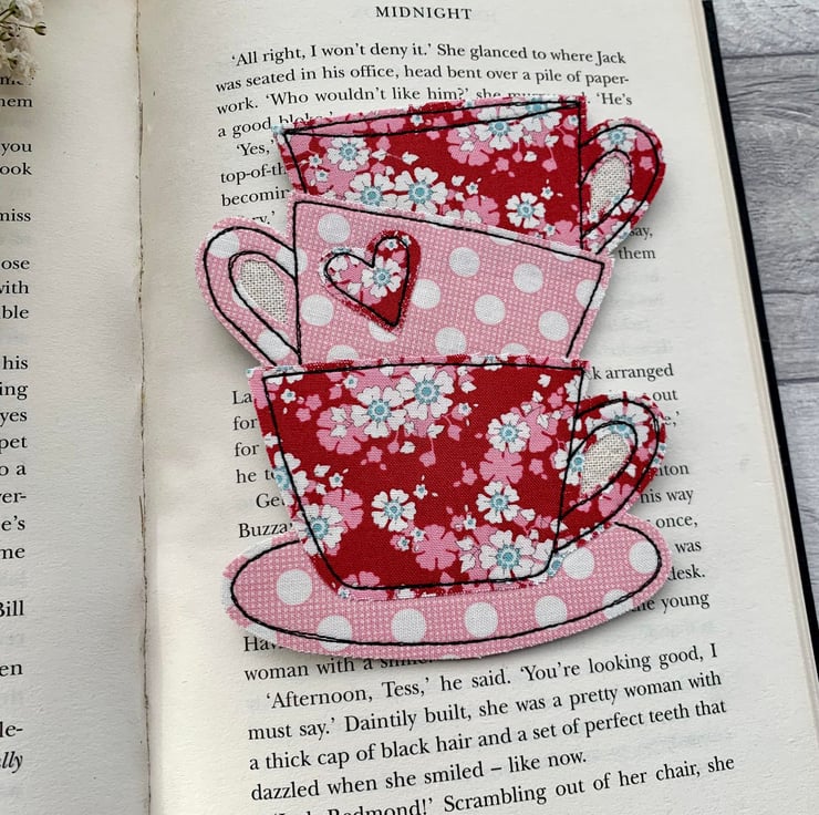 A tea cup stack bookmark in festive reds and pinks, the perfect gift for a tea drinking book lover.