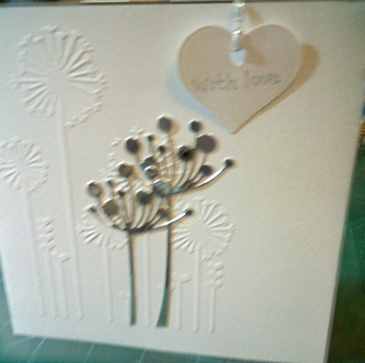 A completely handmade and uniquely designed card. Consisting of dandelion die cut from silver card mounted onto dandelion embossed quality pristine white card. A with love heart dangles from silver cord.