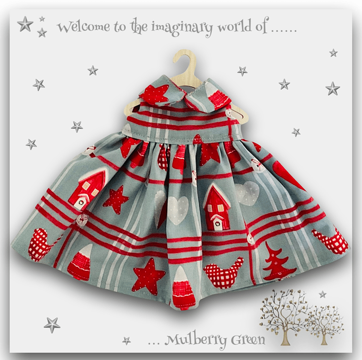 An unusual grey and red Christmas print dress. The dress is made from best quality cotton, has a lined bodice and fastens at the back with a little popper.