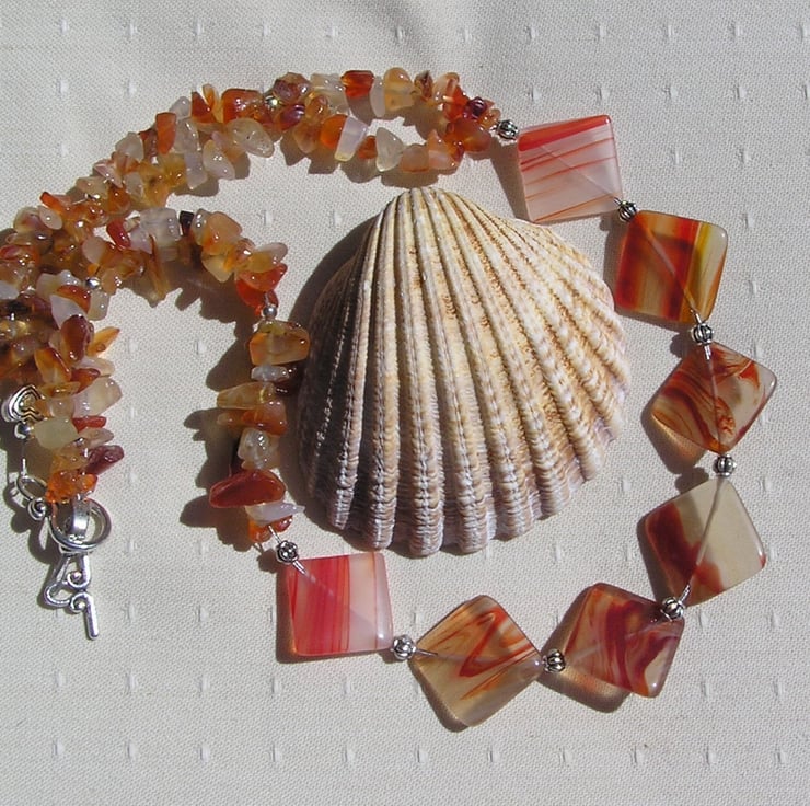This Stunning Necklace is made from Carnelian Agate & Red (Orange in colour) Sardonyx - The Central Sardonyx beads are square shaped strung at the diagonal separated by Tibetan Silver spacers these then flow into double stranded Carnelian Gem Chips - a Gorgeous Warming mix that will look stunning either worn casually or with something more Elegant for a Special Evening out
