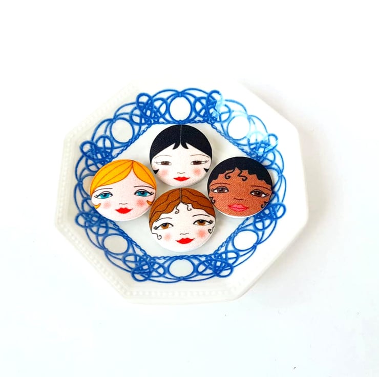 The Kyoko, Alice, Olivia and Coral doll face images on these unique fabric covered sewing buttons are our own designs which have been digitally printed on to 100% cotton. I hand sew the cloth on to button blanks to ensure correct placement of the doll faces and a nice neat secure finish.