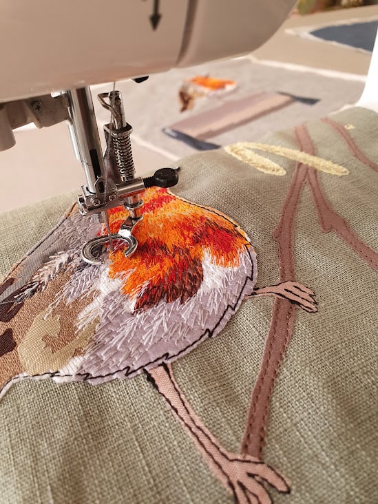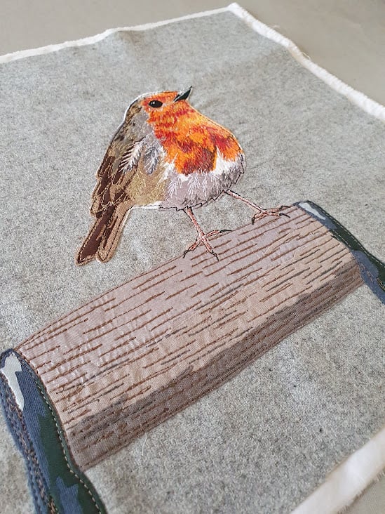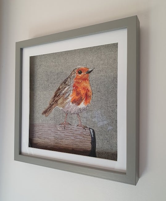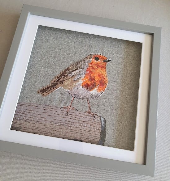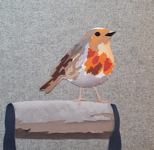 Beautiful embroidered Robin sitting on a spade handle, created using fabric applique and freehand machine embroidery.