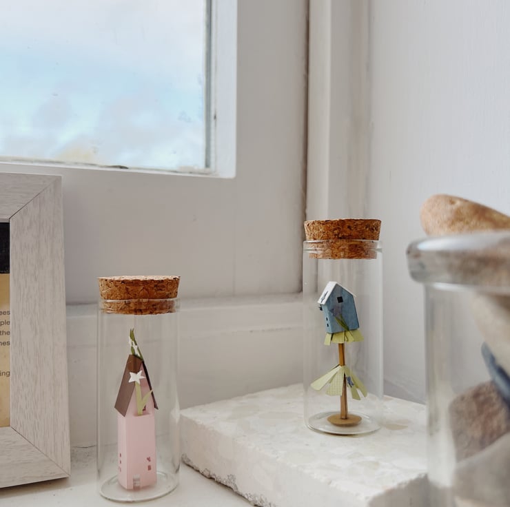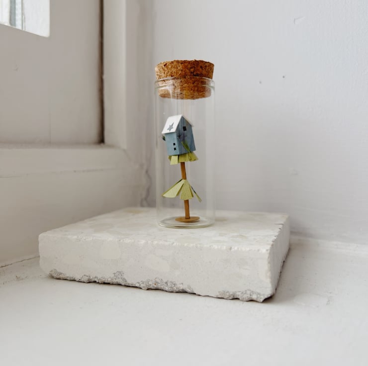 Tiny house on a pine tree. Handmade paper houses in a glass jar with a cork lid. One of a kind and sculpted, cut, and fixed entirely by hand.