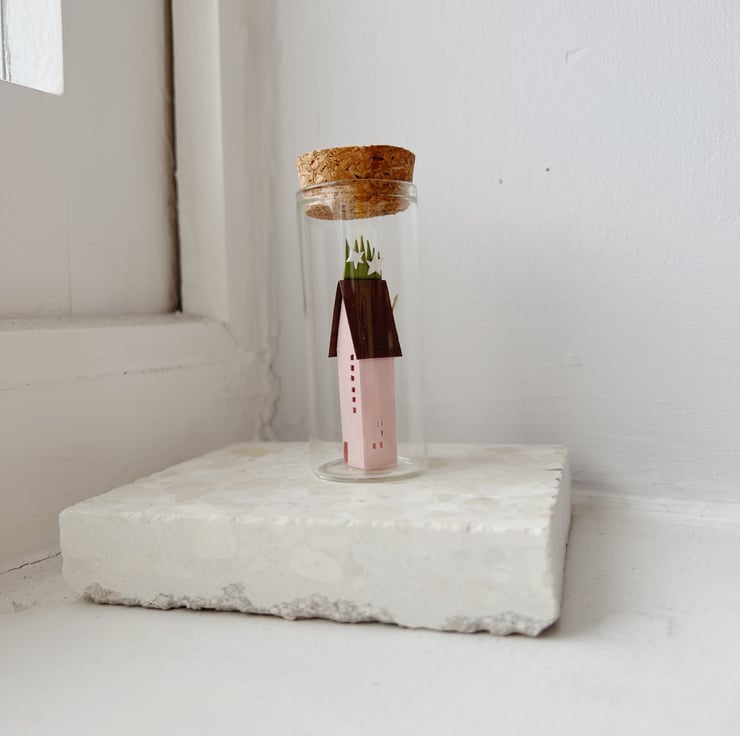 Tiny Pink Tower House. Handmade paper houses in a glass jar with a cork lid. One of a kind and sculpted, cut, and fixed entirely by hand.