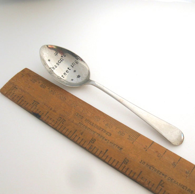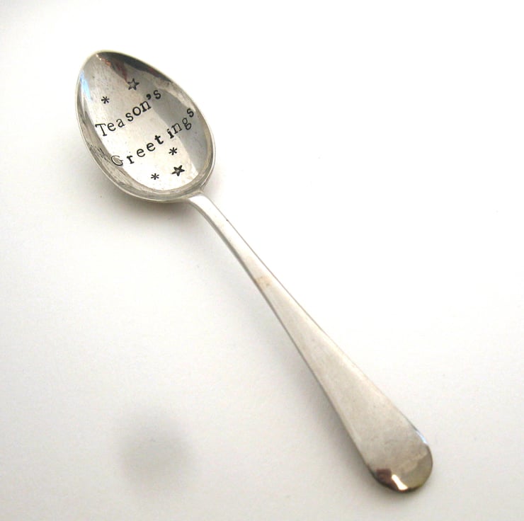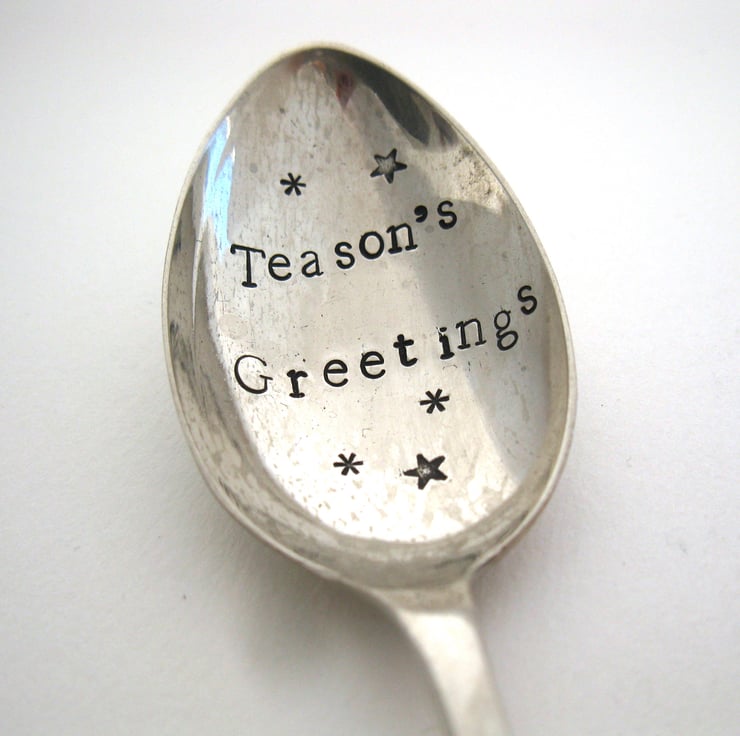 Give a tea lover the gift of a giggle at Christmas with this hand stamped vintage alloy tea spoon that has the words 'Teason's Greetings' in black lettering in the bowl. It measures approximately 13cm long and has a plain 'old english' handle.