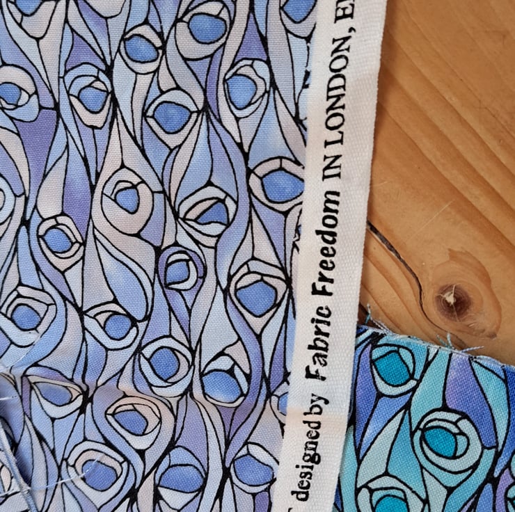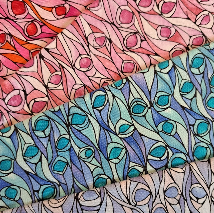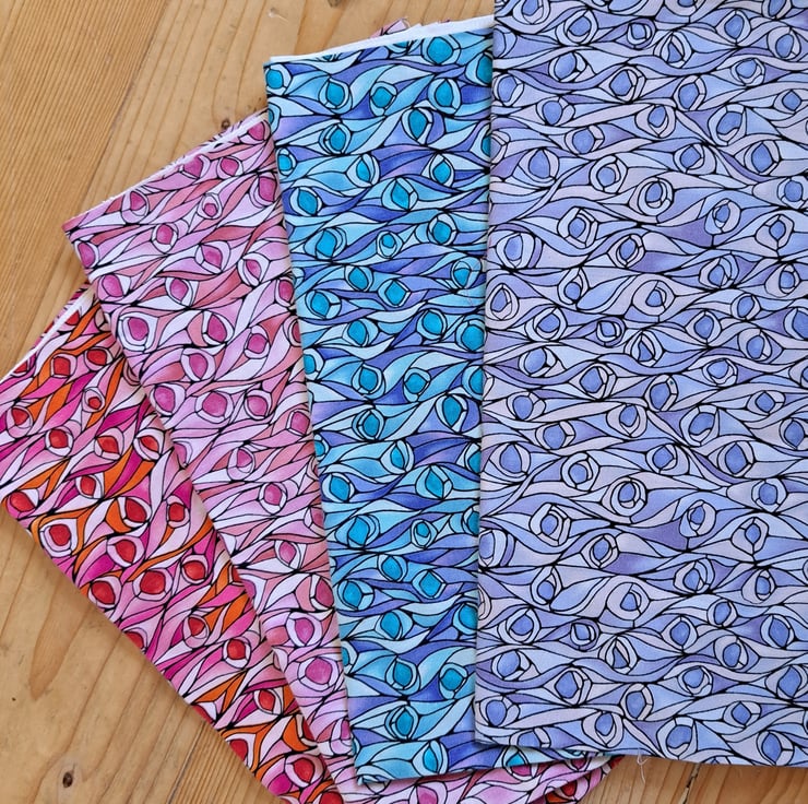 Four good-sized pieces of striking quilting fabric - new and unused. Approx fat quarter size - 111cm (44in) by 34cm (13.5in). The design is Clear Cut by Fabric Freedom. Four coordinating colours (blues, oranges and pinks), ideal for a contemporary quilt.