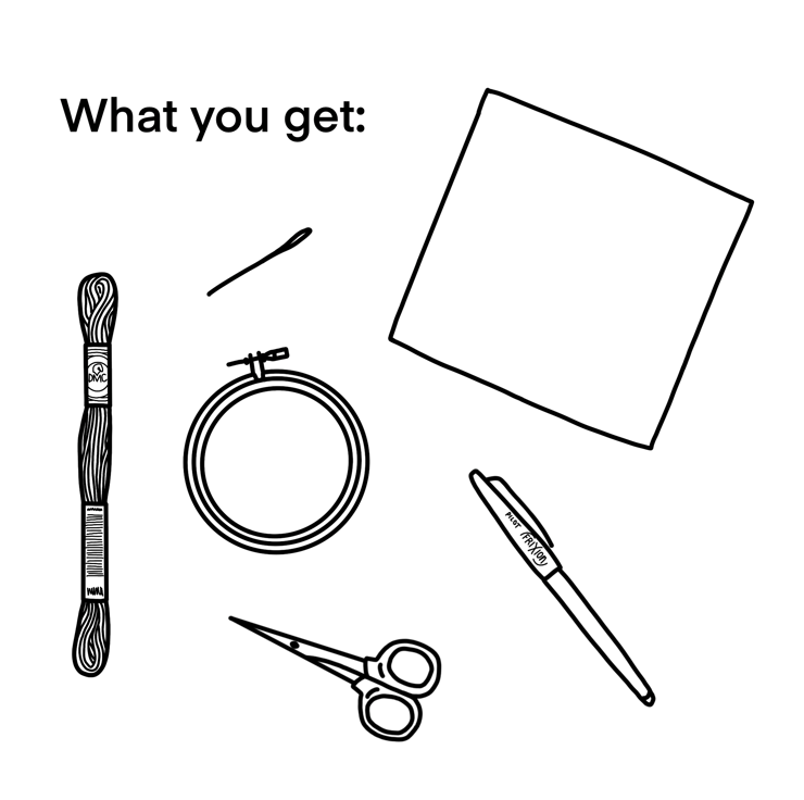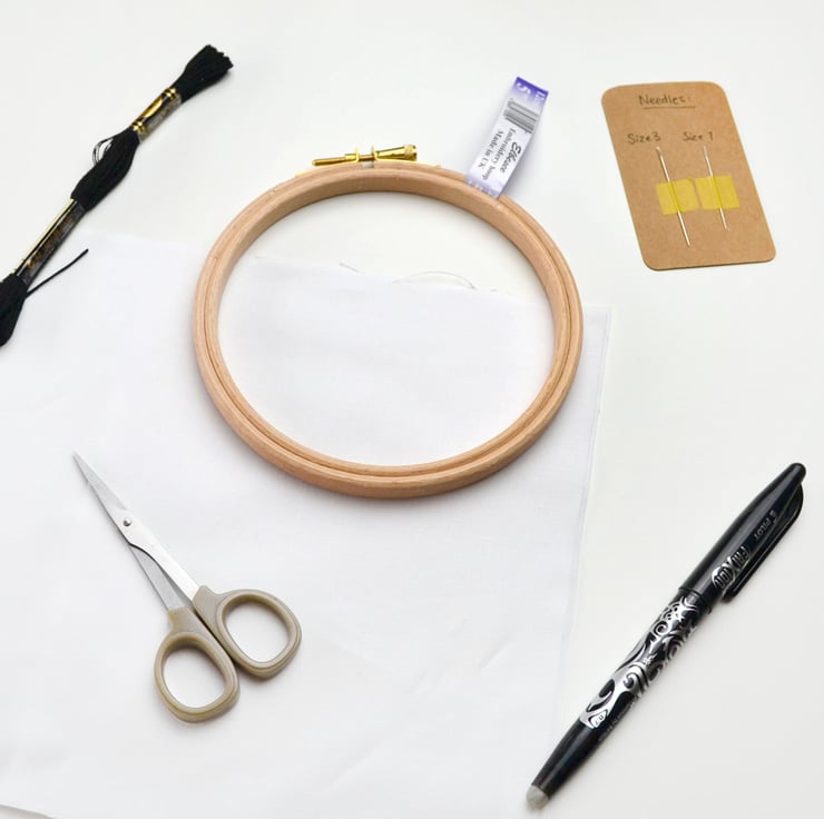 What you'll get: 5" embroidery hoop, 2 pieces of white cotton fabric, Black DMC embroidery thread, 2 needles, Embroidery scissors, Heat erasable Frixion pen