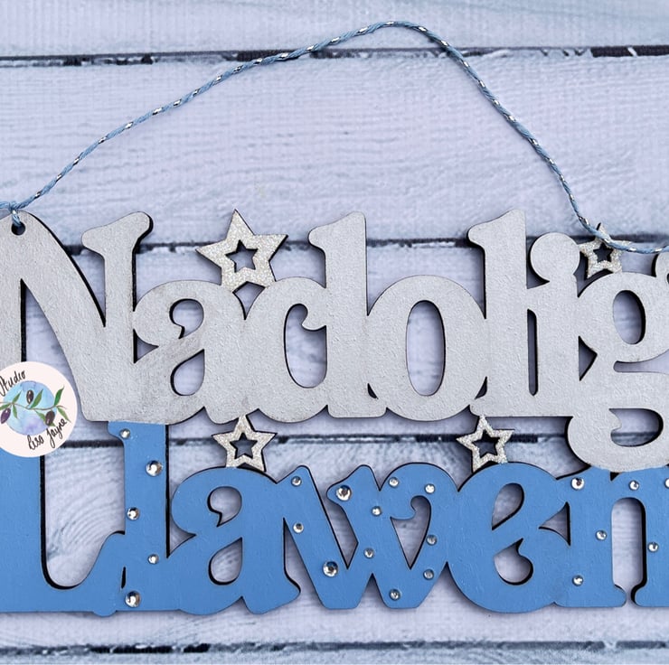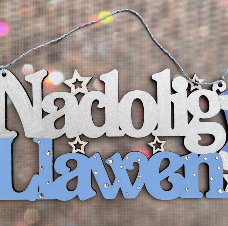 Gorgeous Nadolig Llawen (Merry Christmas in Welsh) Christmas sign that has been painted using acrylic paints and complimented with silver diamantés that catch the light beautifully. The sign is strung with blue and silver twine.