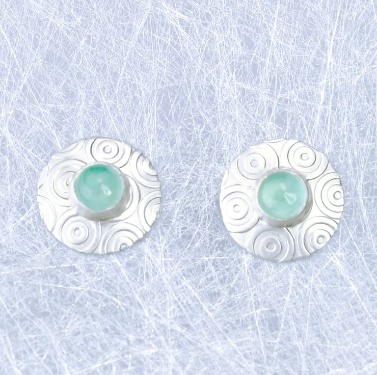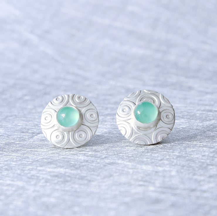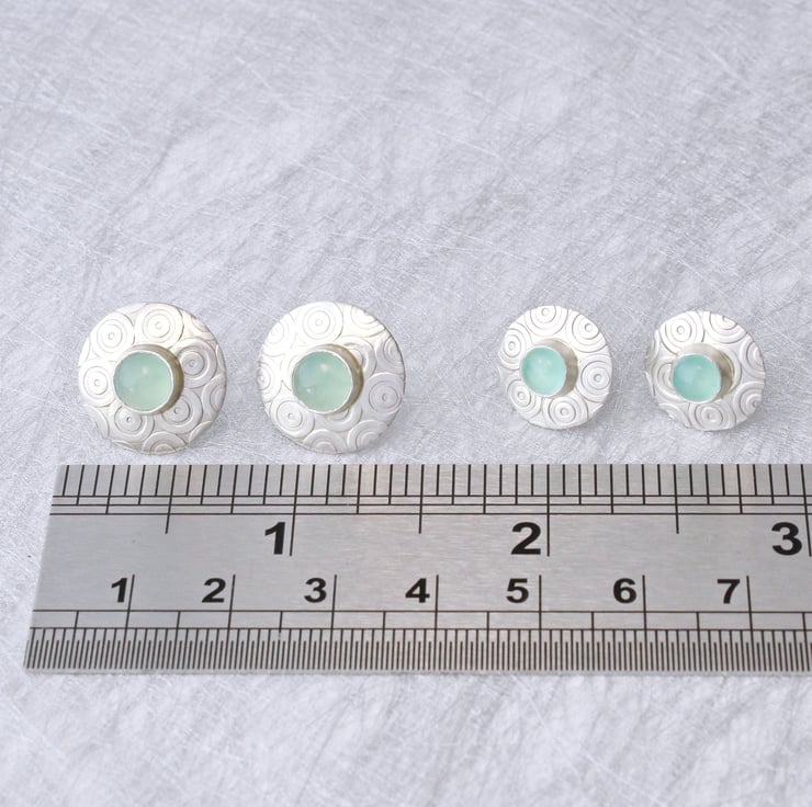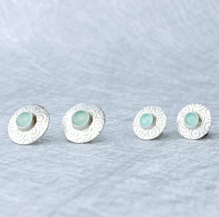 These elegant small stud earrings have been designed and handmade by us, in our workshop in Yorkshire. They are slightly domed in shape and are made from sterling silver with a matt satin finish, they measure 13mm in diameter and feature two lovely 5mm Aqua Chalcedony gemstones. The ear stud backs and posts are sterling silver. We also make other items of jewellery in this range including a matching pendant and brooch, which can be seen in the photos.