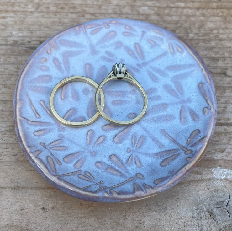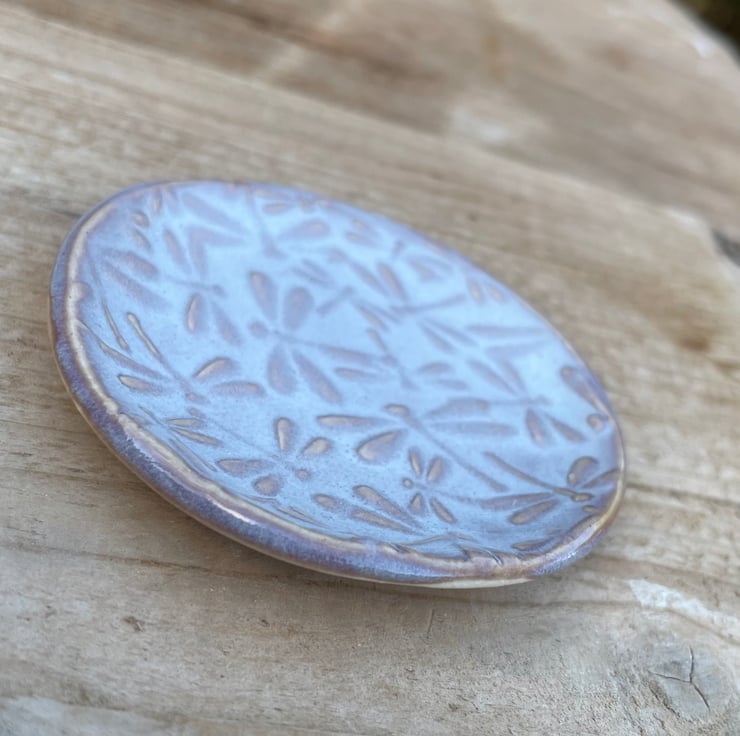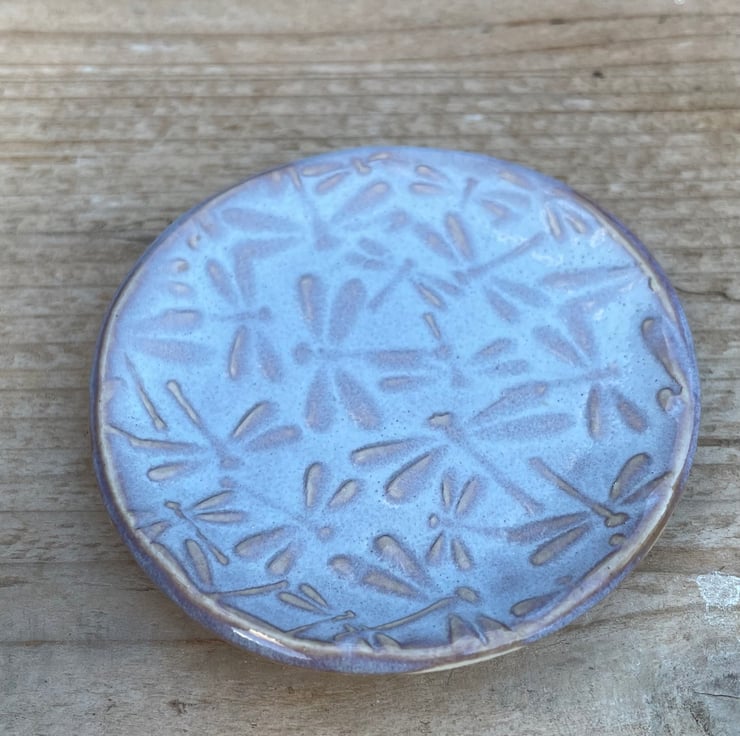 The piece features a simple but effective raised design of dragonflies peeping through a pale lavender glaze.