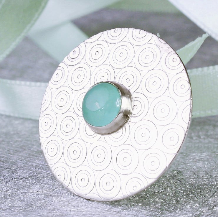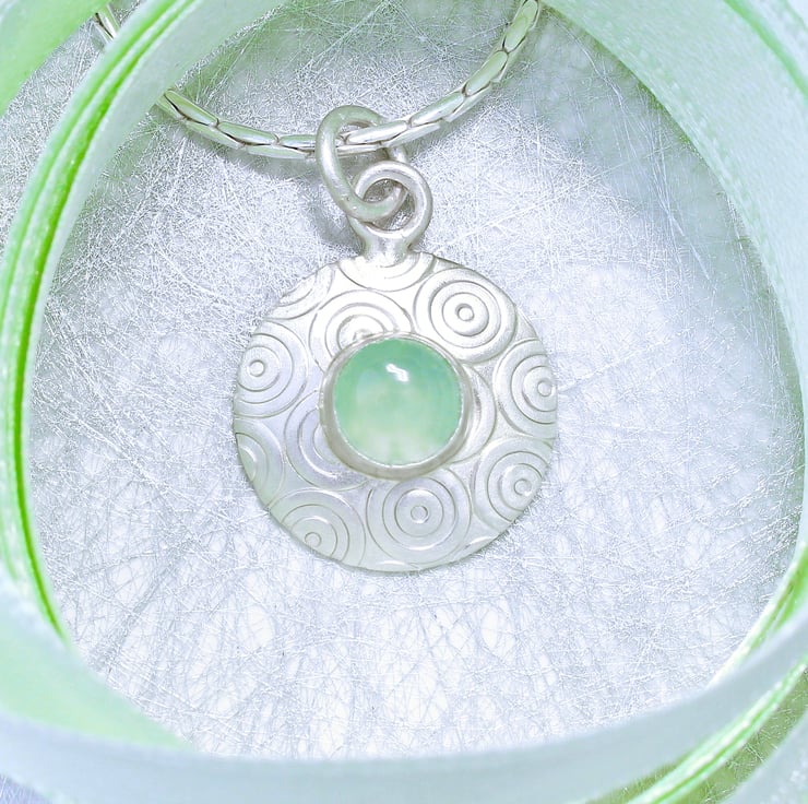 This matt satin silver pendant has been designed and handmade by us, in our workshop in Yorkshire. It measures 16mm in diameter and is slightly domed in shape, it is made from sterling silver and features a beautiful 6mm Aqua Chalcedony gemstone. The pendant hangs on a 42cm quality sterling silver chain. We also make other items of jewellery in this range, as seen in the photographs.