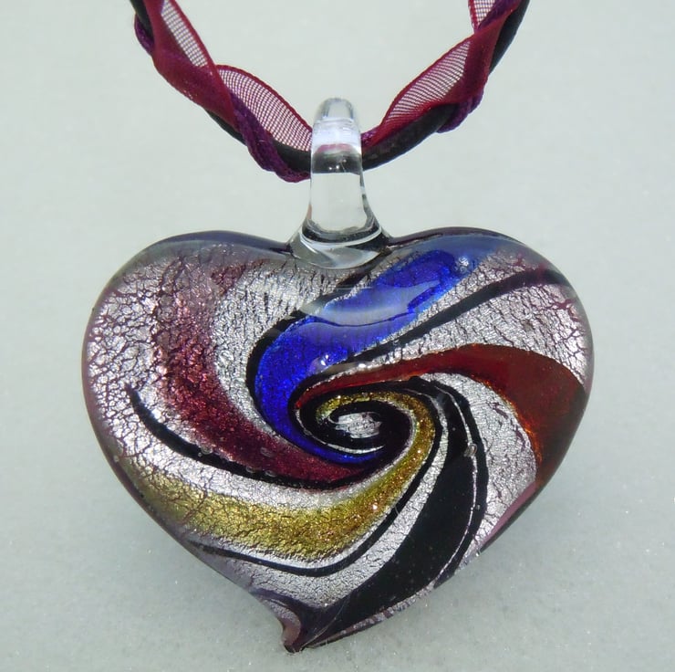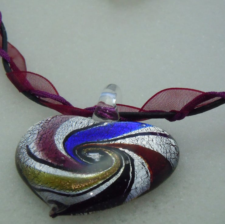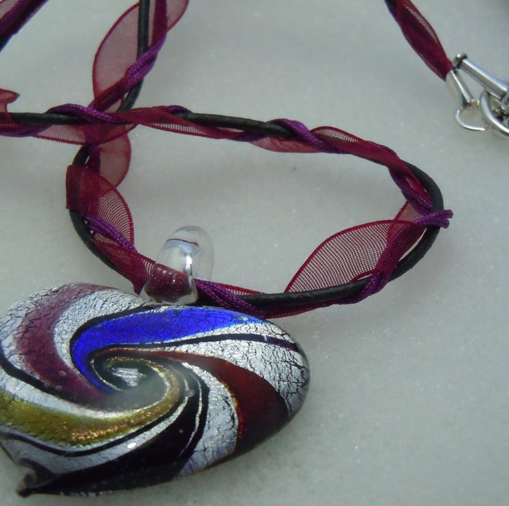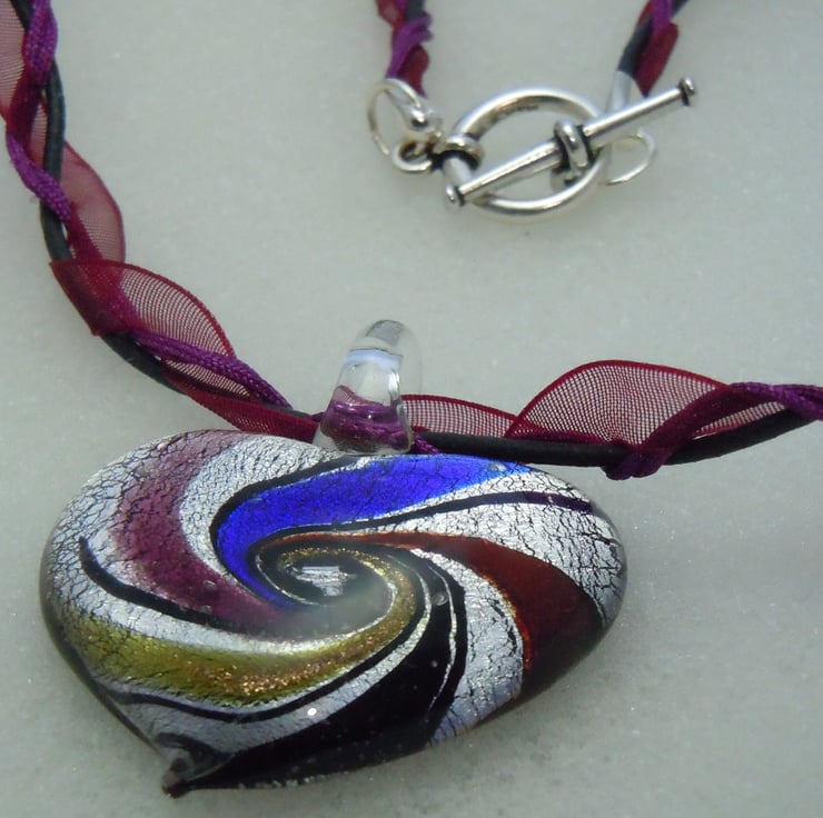 A stunning Murano style foil glass heart shape pendant with swirls of Goldstone, silver, purple, plum, blue, black & brown colours & threaded on plaited ribbon & cords & finished with silver plate fittings & toggle clasp.