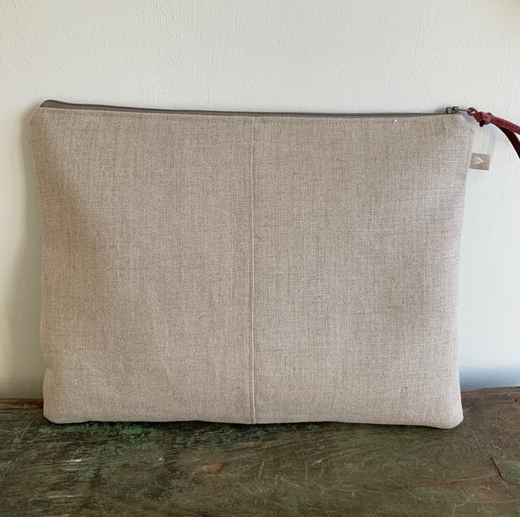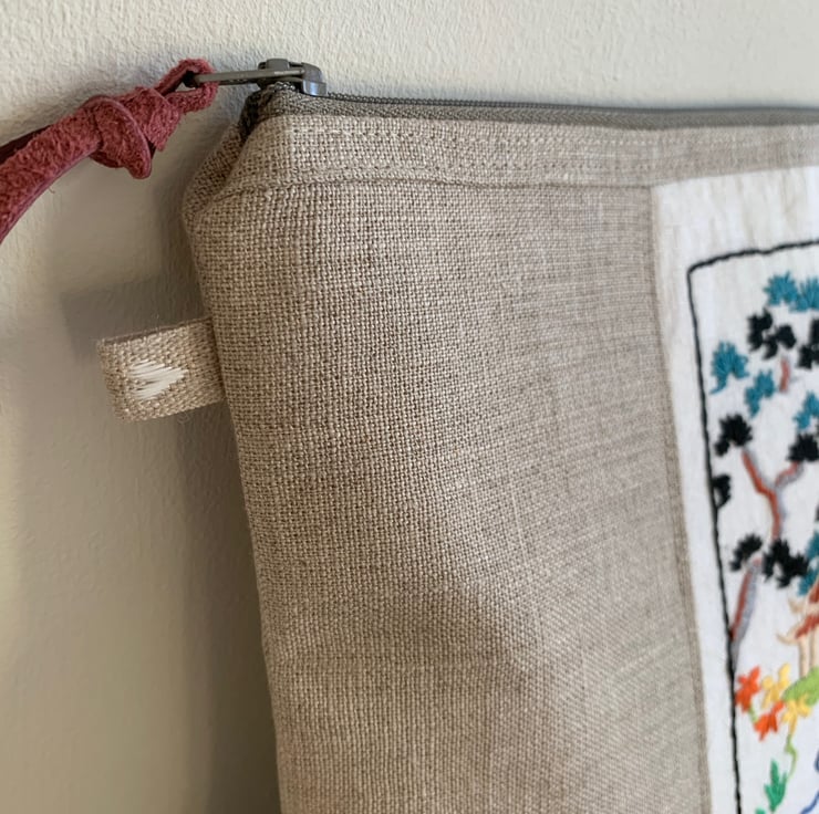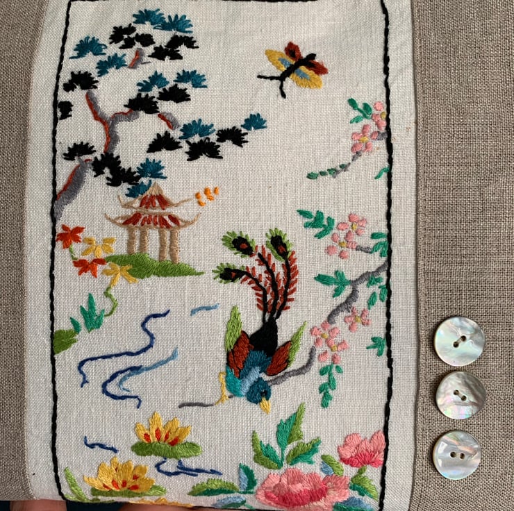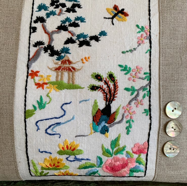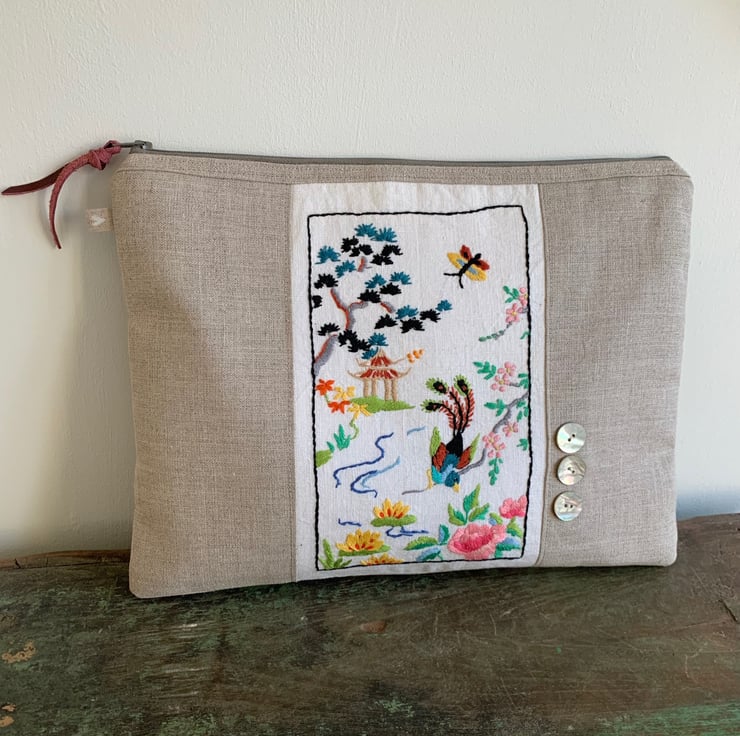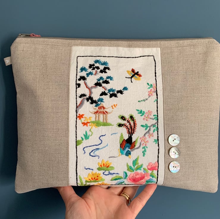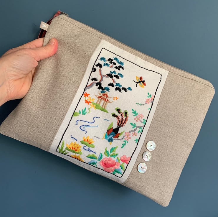 I found this pretty embroidery in a pile of fabric scraps at a vintage fair and thought it deserved to be rescued. I’ve framed it with natural linen and formed a large zip pouch. It has a pretty floral lining of reclaimed cotton and it’s finished with 3 mother of pearl buttons.