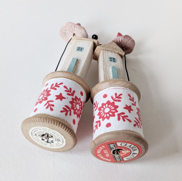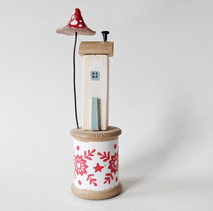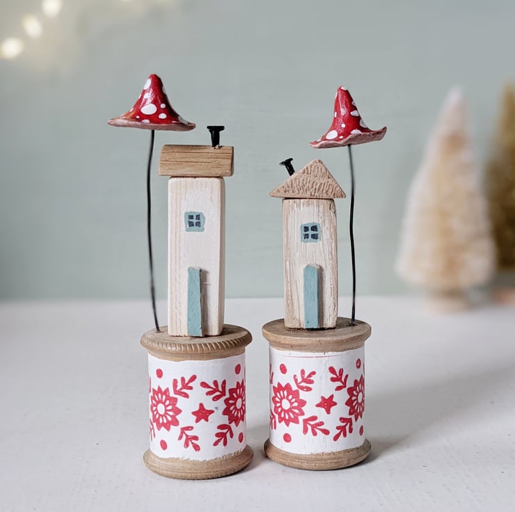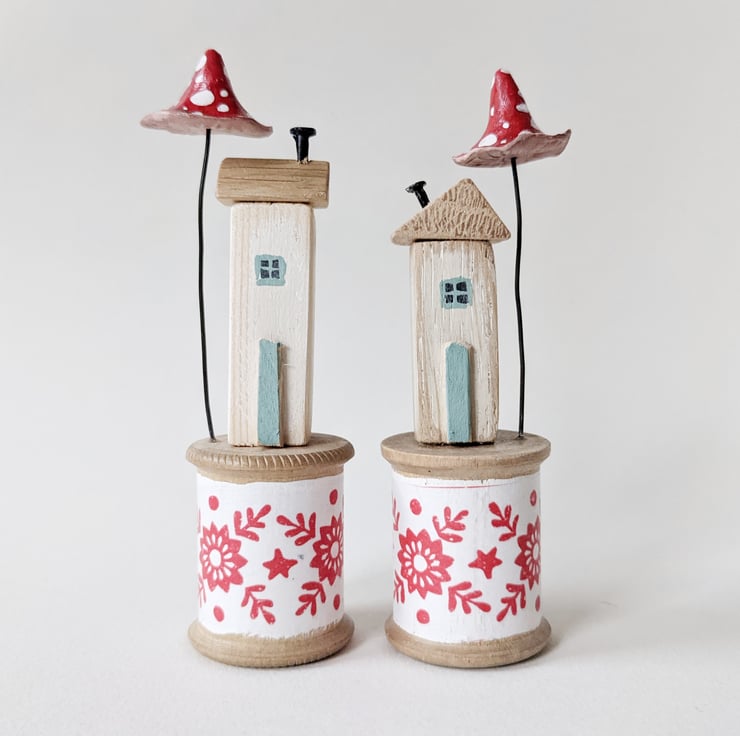 I love finding these old bobbins on rummaging trips! The tiny homes perch happily on top.