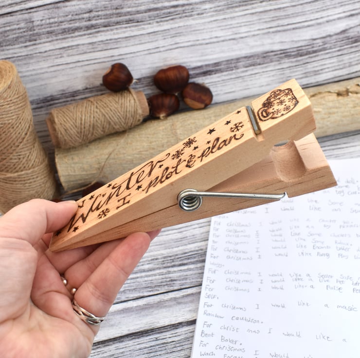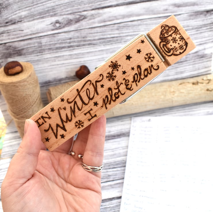 A large wooden peg that would be great to keep loose papers together on your desk! Featuring the words 'In winter I plot and plan' and a sprinkling of snowflakes to the reverse. Hand burned using pyrography, with my own original designs.