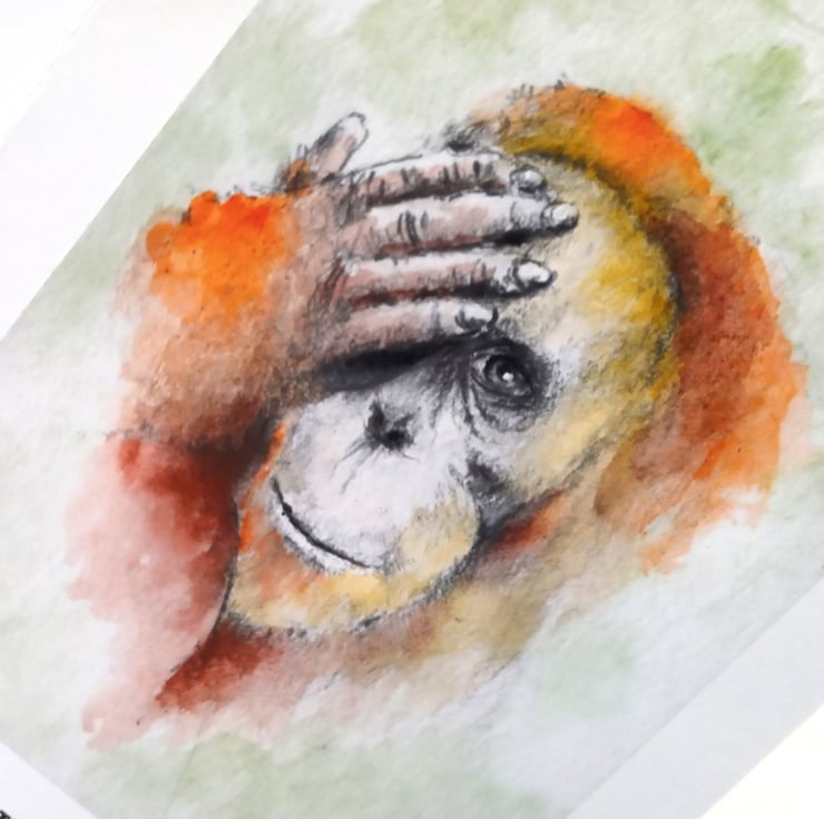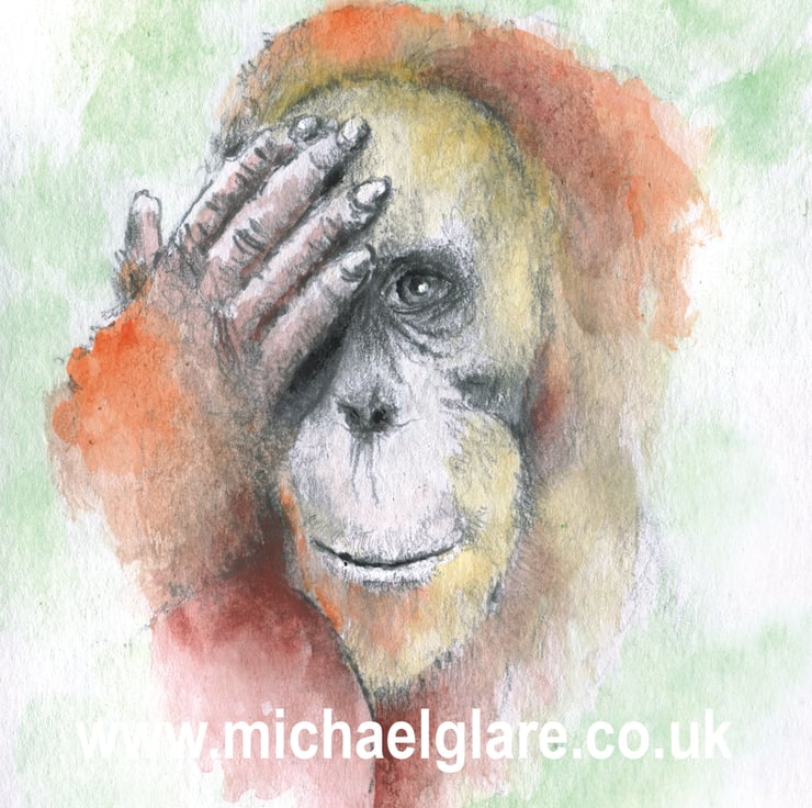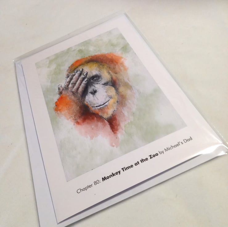 An original hand painted watercolour print of a Monkey Orangutan printed Greeting Card, taken from the illustrated book 'I am Michael Glare and this is my Life', with 400 watercolour prints just like this. 'Every watercolour has a story.' Card size 9" x 6" inside blank for writing on with a plain white envelope.