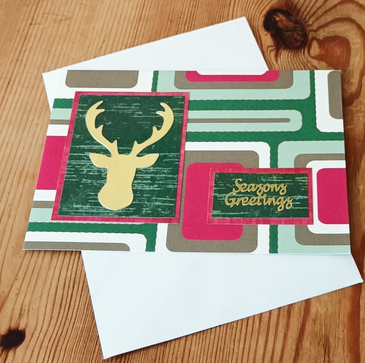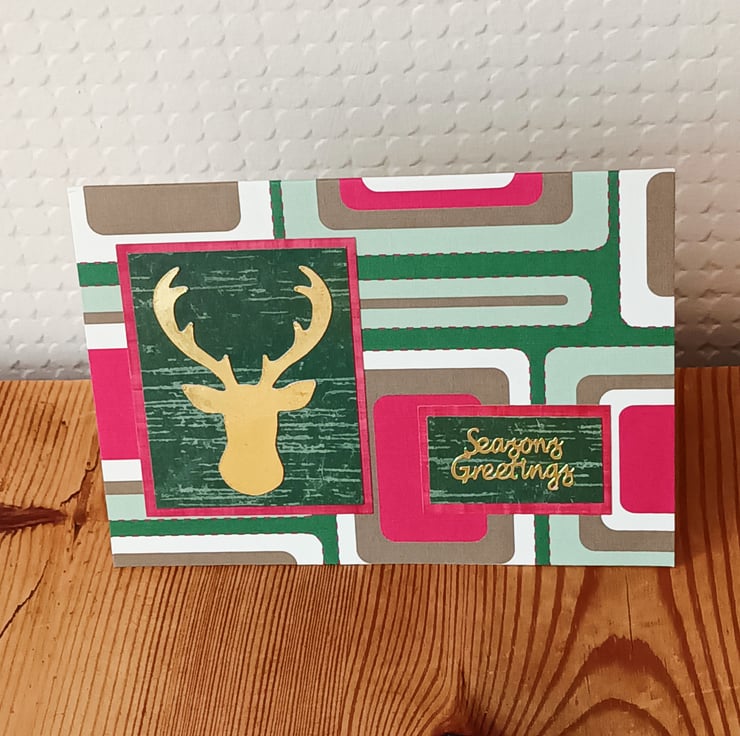 A card featuring a stag head added to layers of dark green and dark red paper attached to a colourful card blank. The card is finished with “Seasons Greetings” in gold letters on dark green and dark red papers.