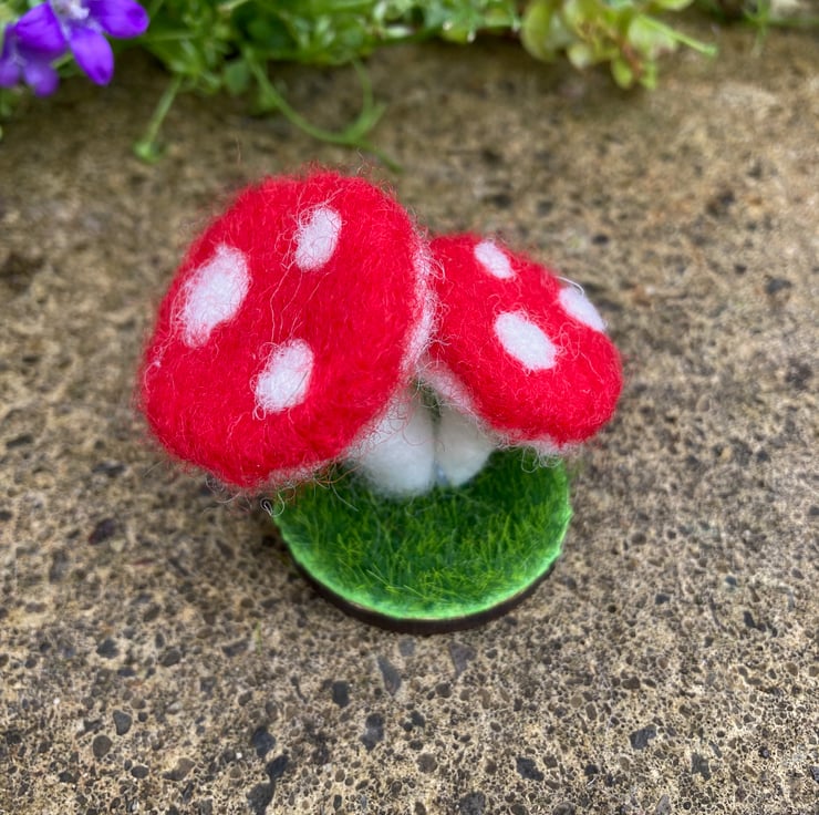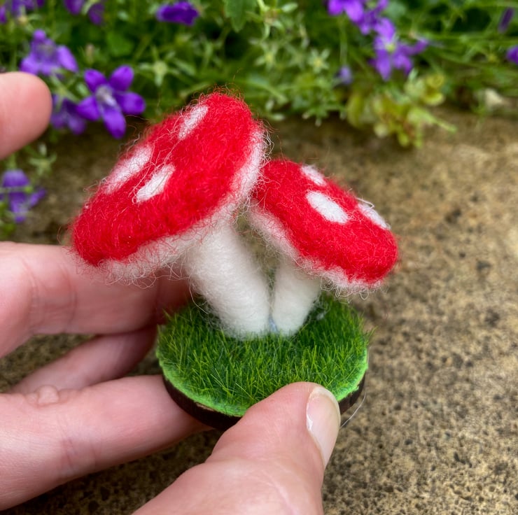 This listing is for two miniature toadstools which have been needle felted and mounted on a 'grass' covered wooden disc. The disc is approximately 4cm in diameter and the ornament stands approximately 5cm tall.