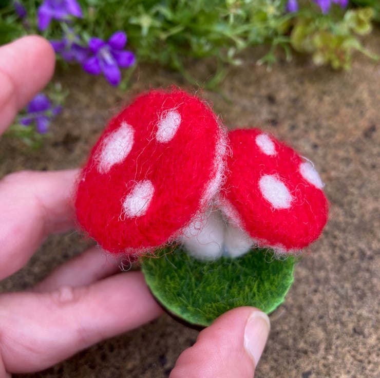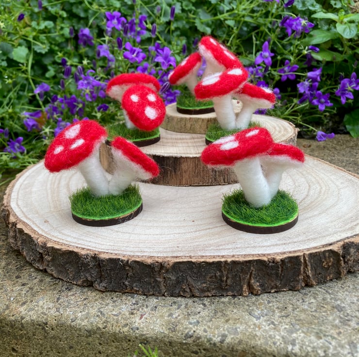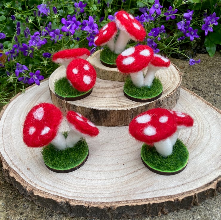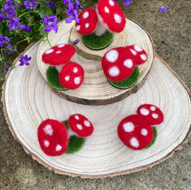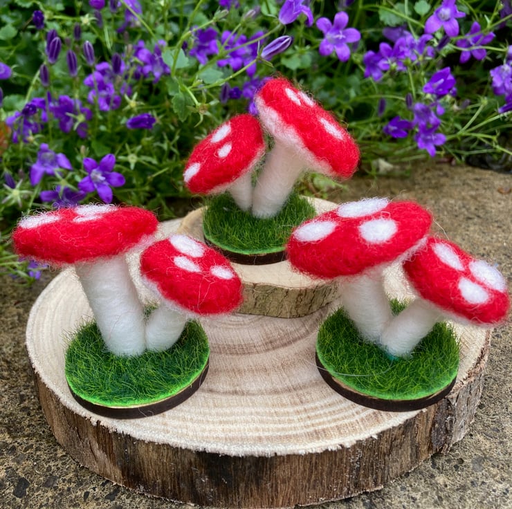 The toadstools have a red cap with white spots, a white underside and stalk. They are made from woollen fibres.