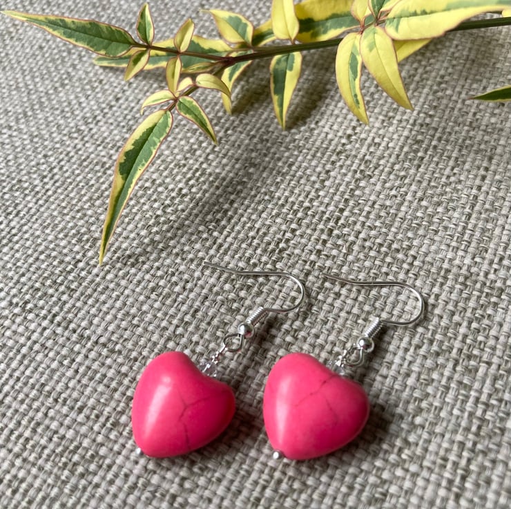 Lovely bright earrings made with dyed turquoise hearts, tiny sparkly Swarovski crystals and silver-plated earring hooks. Available in a range of colours. The hearts have a pretty and very subtle crackle effect, making each one unique. The earrings are approximately 4cm in length including the hook, and the heart is approximately 15mm in width.
