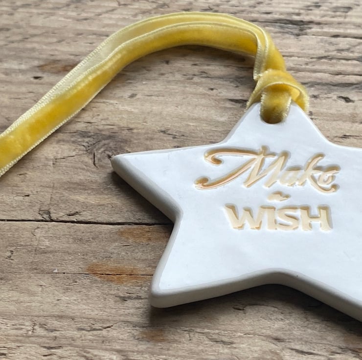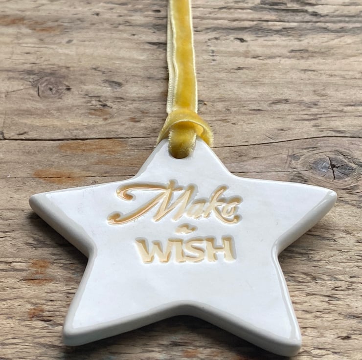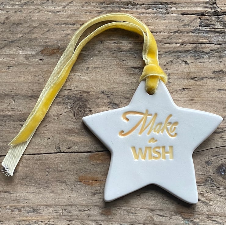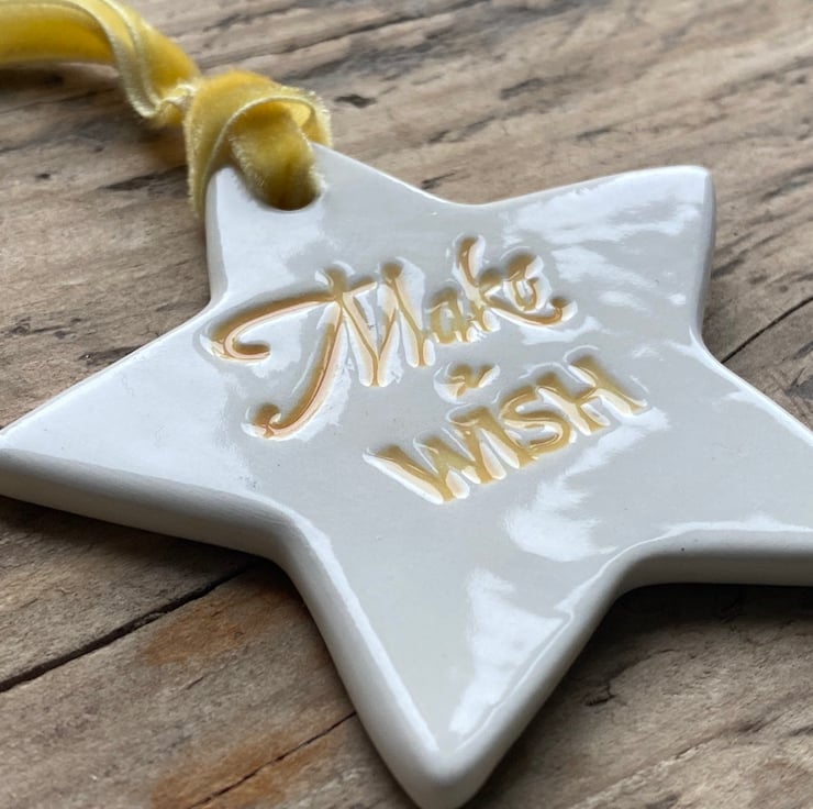 Lovely Ceramic Star hand formed from Earthenware Clay and imprinted with the words " Make a Wish". The words have been glazed in Yellow before the front of the star has had 3 coats of transparent glaze.